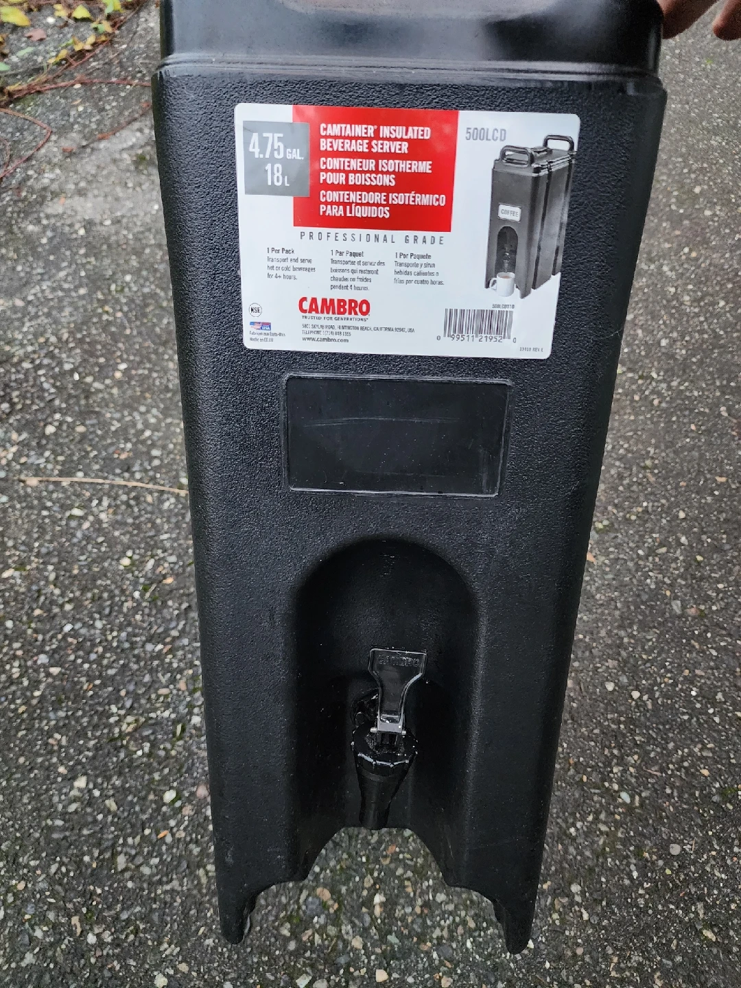 96I'm selling a Cambro Cantainer insulated beverage server in great condition! It's perfect for keeping your beverages hot or cold for hours. - 4.75 Gallon / 18 Litre capacity - Insulated to keep beverages hot or cold - Professional grade - Ideal for transporting and serving beverages