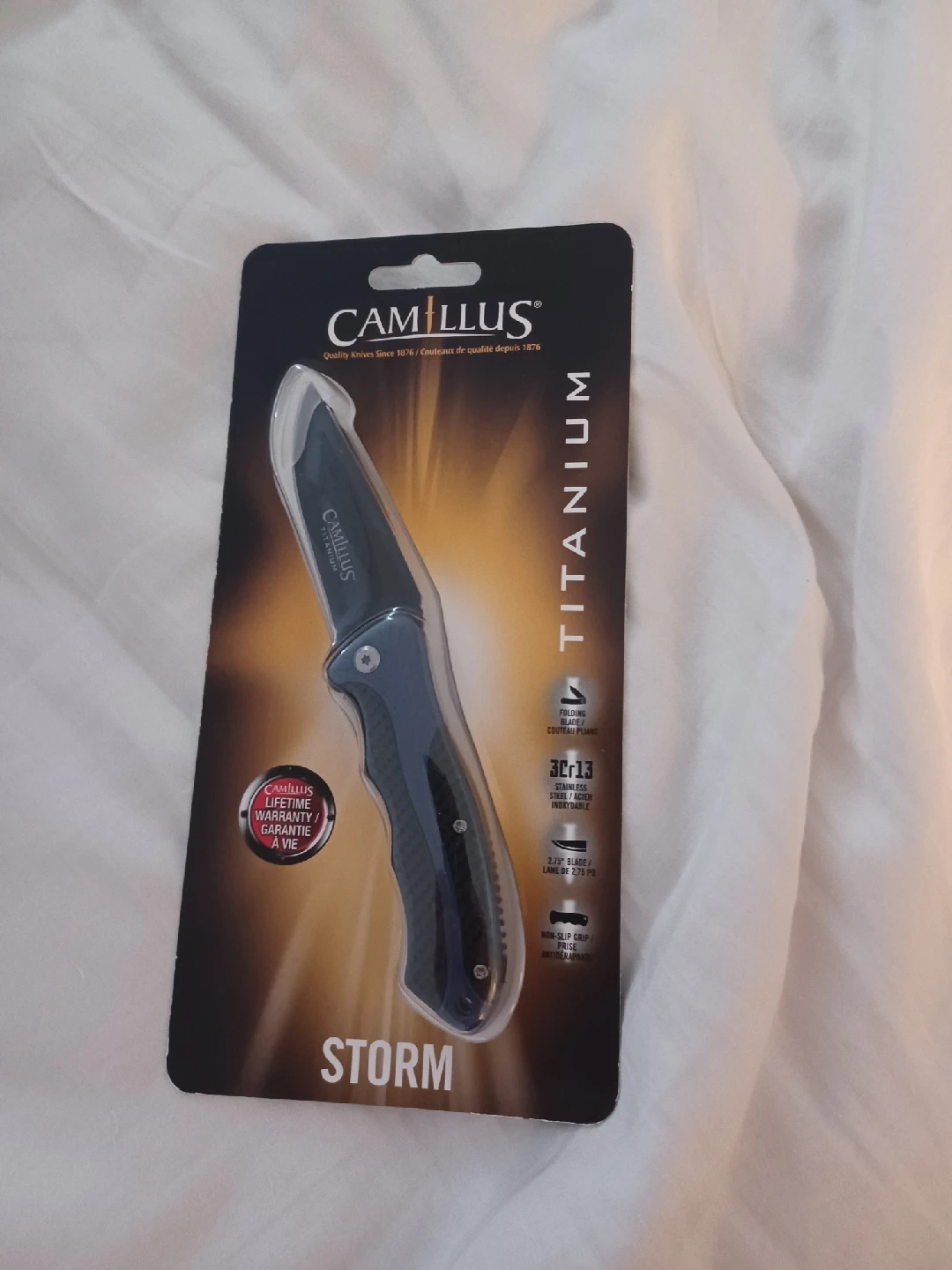 65Selling a brand new Camillus Storm Titanium folding knife! This quality knife has been around since 1876. It features a 3Cr13 stainless steel blade and a non-slip grip for added safety.