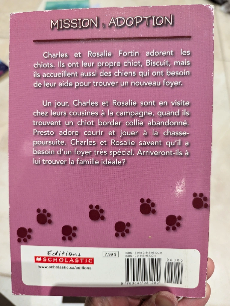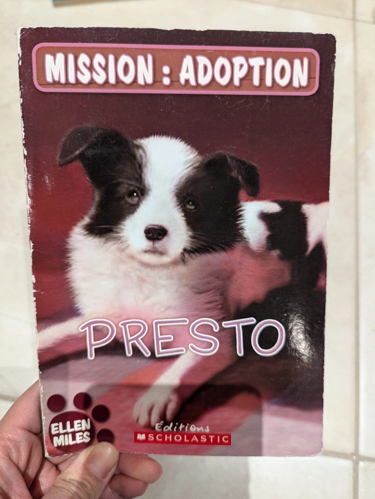 Children's book. French language. Part of the Mission: Adoption series. Features a border collie puppy. Scholastic Editions.