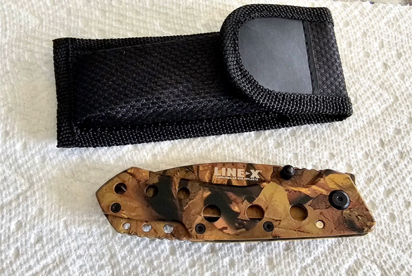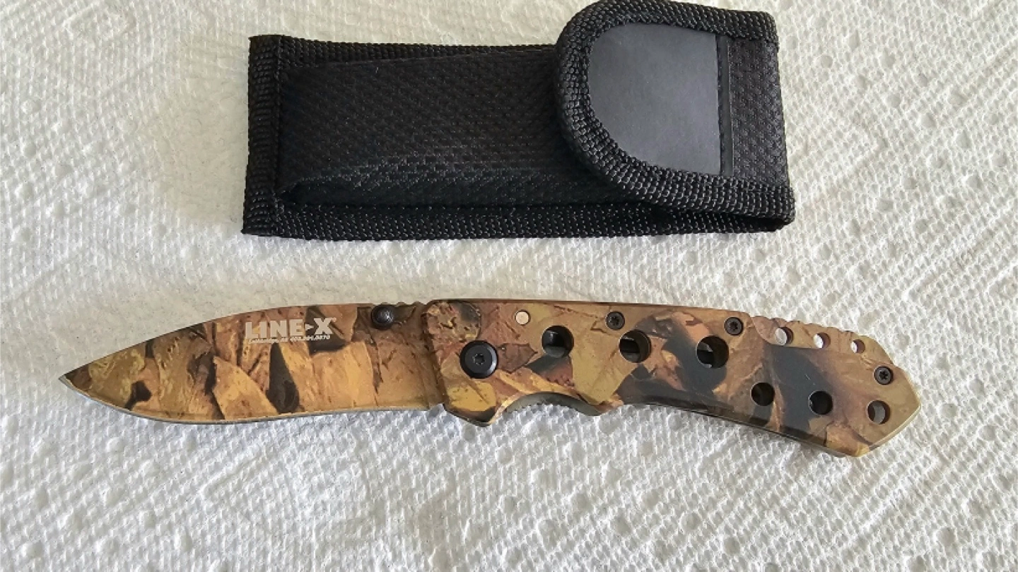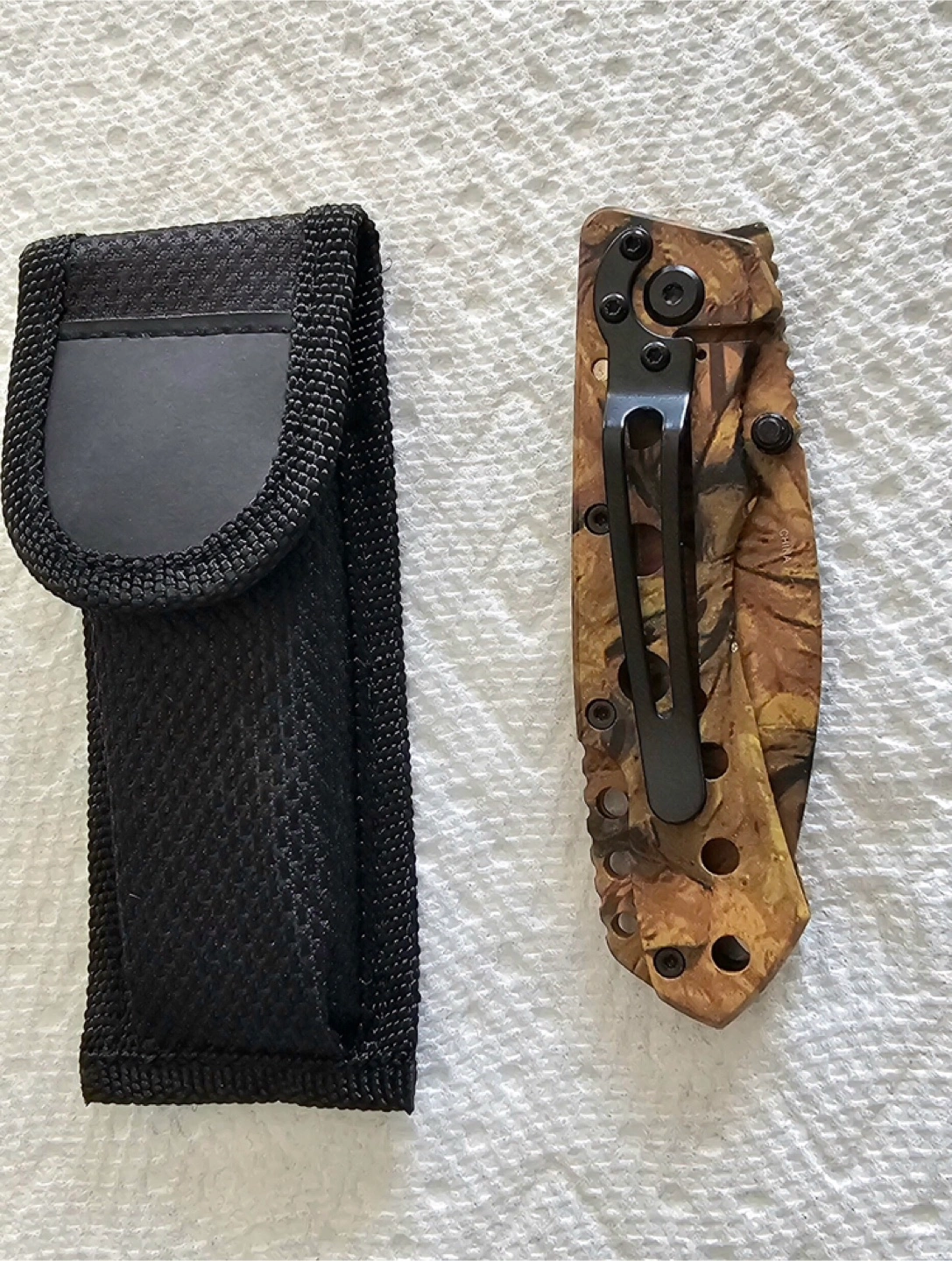 28Never used folding pocket knife. Camo pattern. Includes nylon sheath.