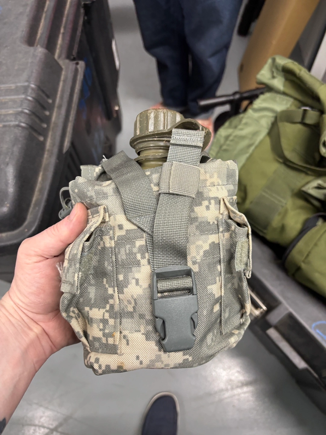 Used military canteen. Features a green plastic top and a camouflage carrying case with a plastic buckle.