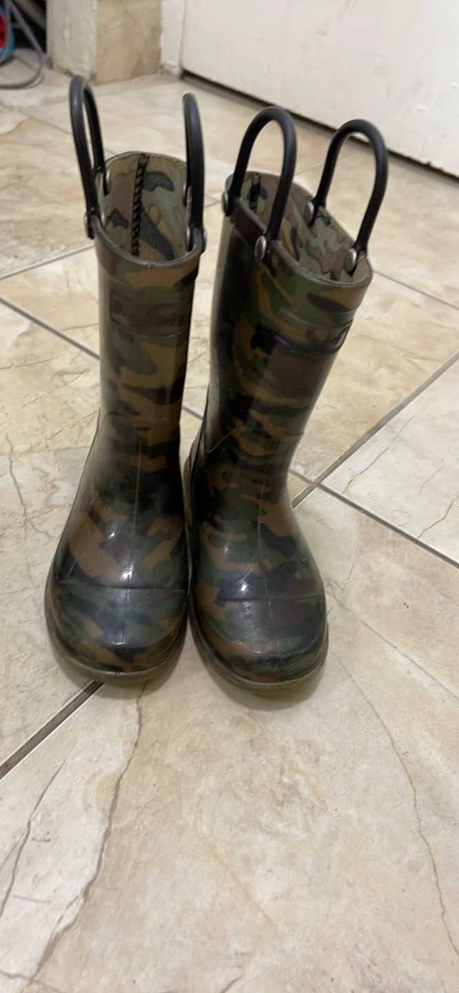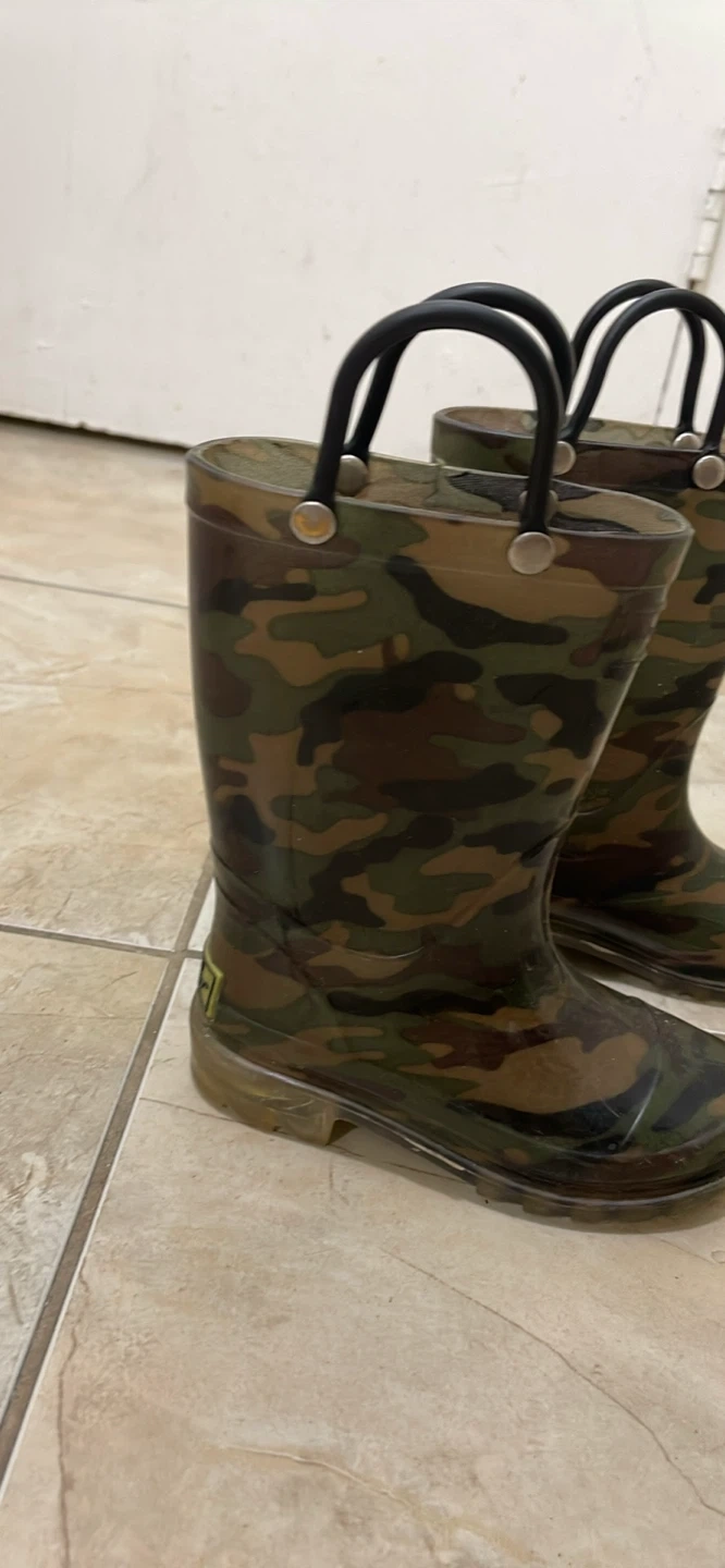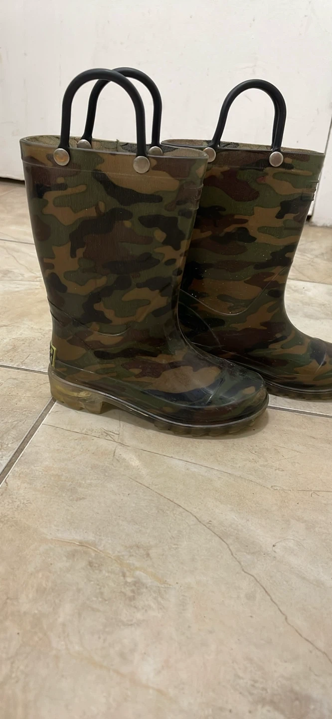 10Rain boots with a camouflage pattern and handles for easy carrying. Perfect for puddle jumping! Size 8