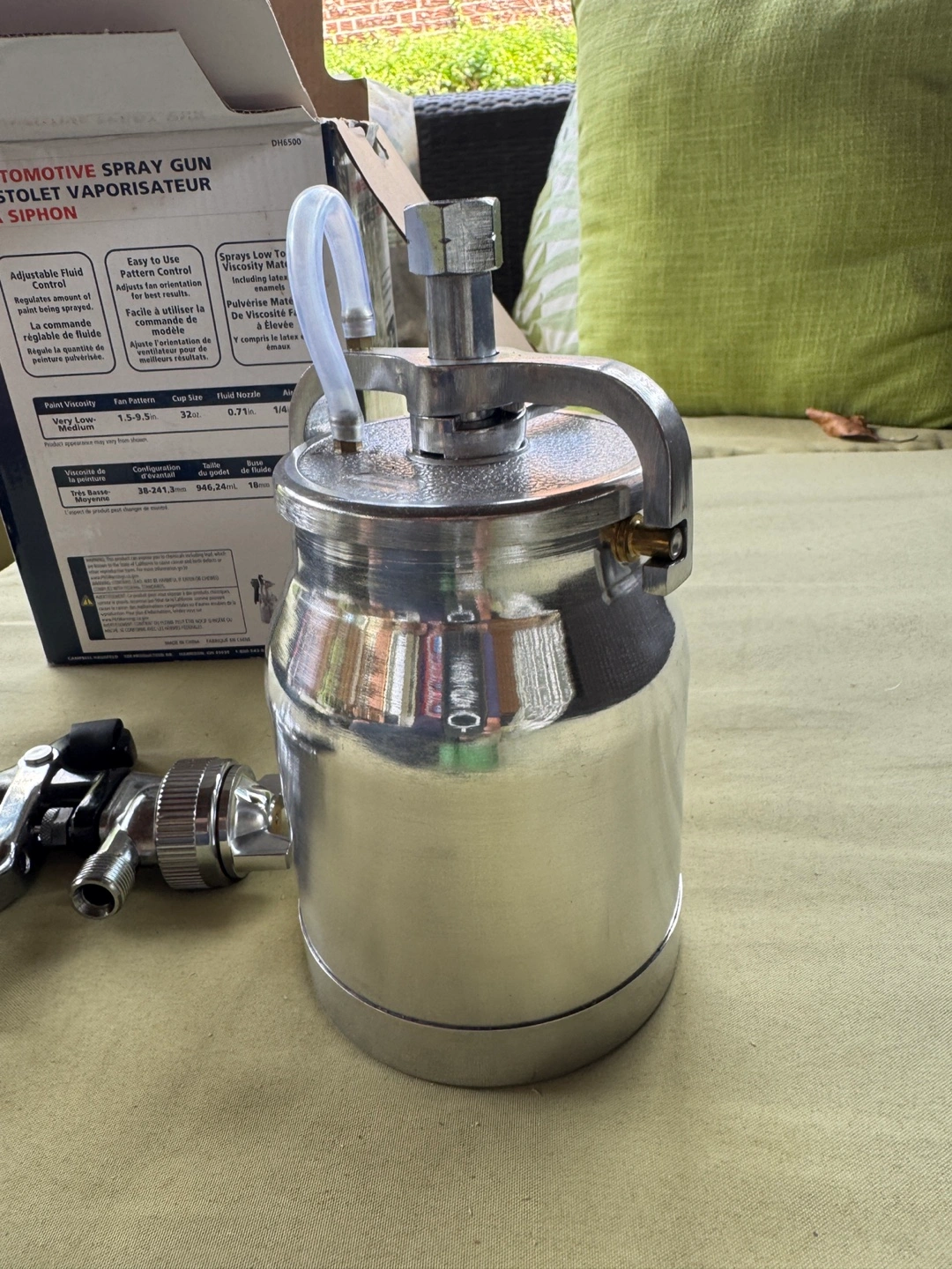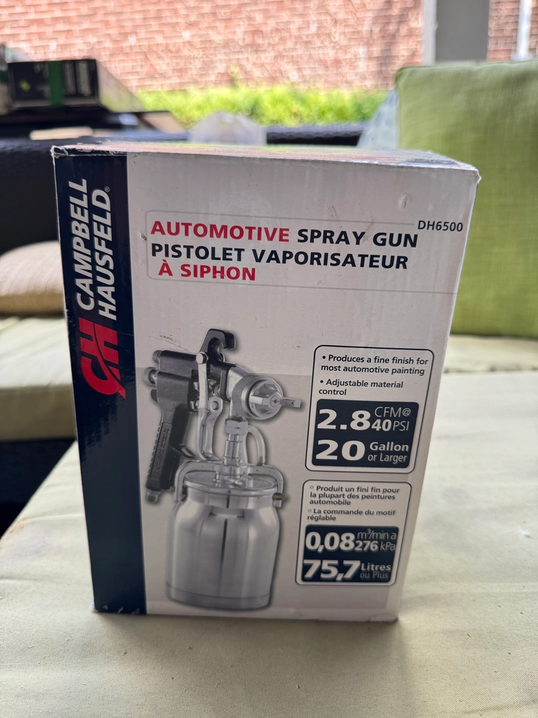 Selling a Campbell Hausfeld automotive spray gun, model DH6500. It produces a fine finish for most automotive painting and has adjustable material control. Brand new in box!