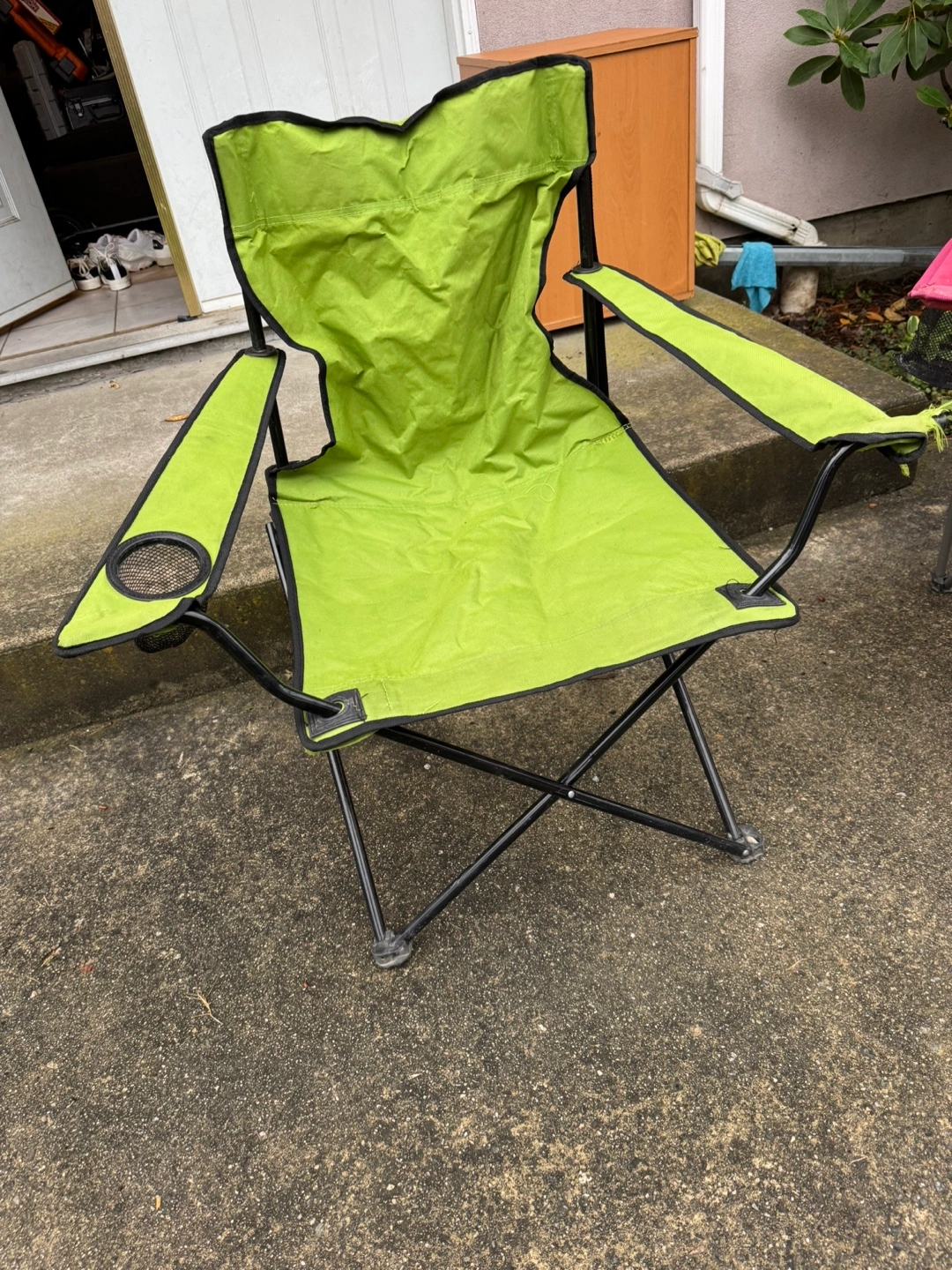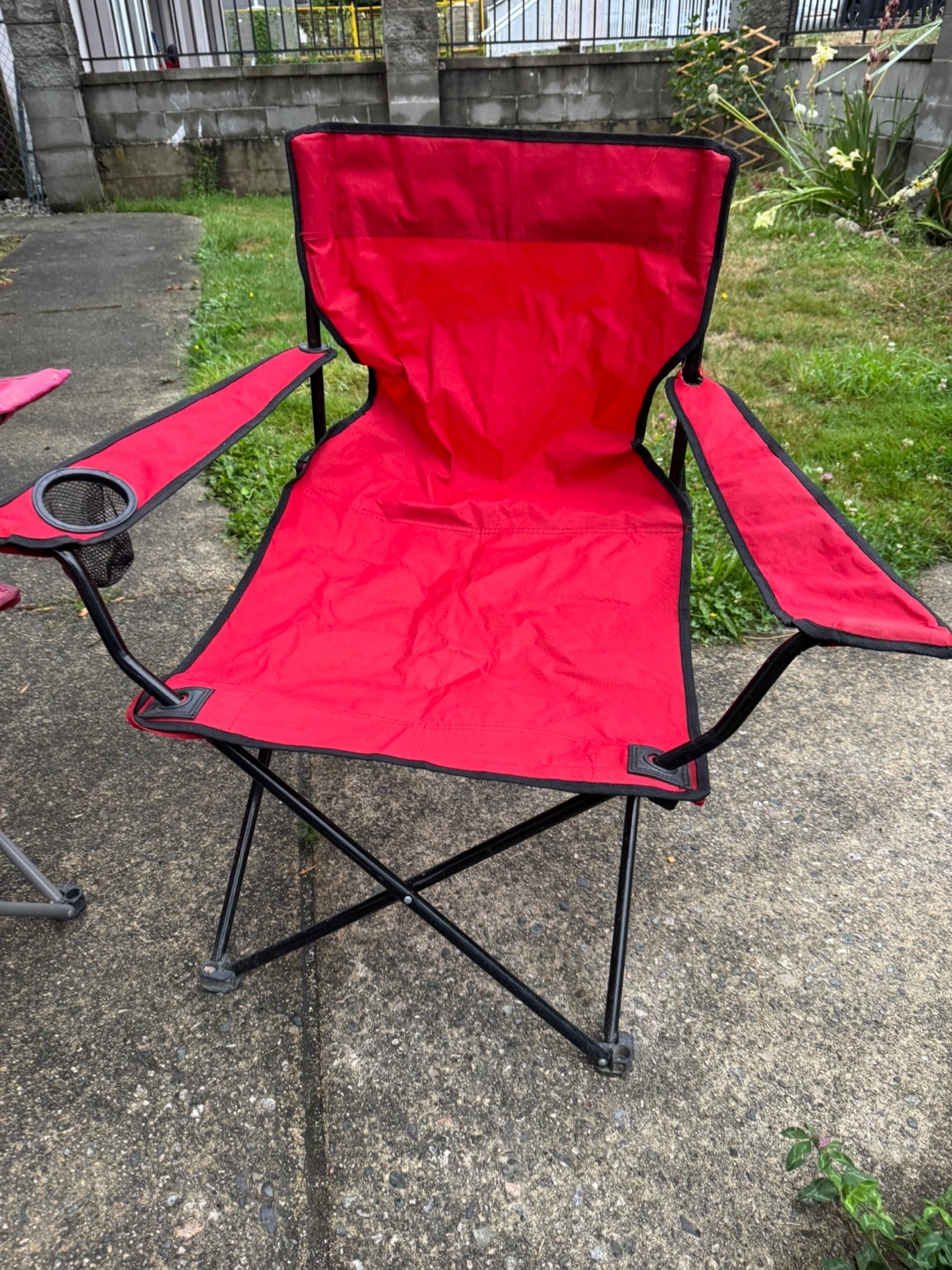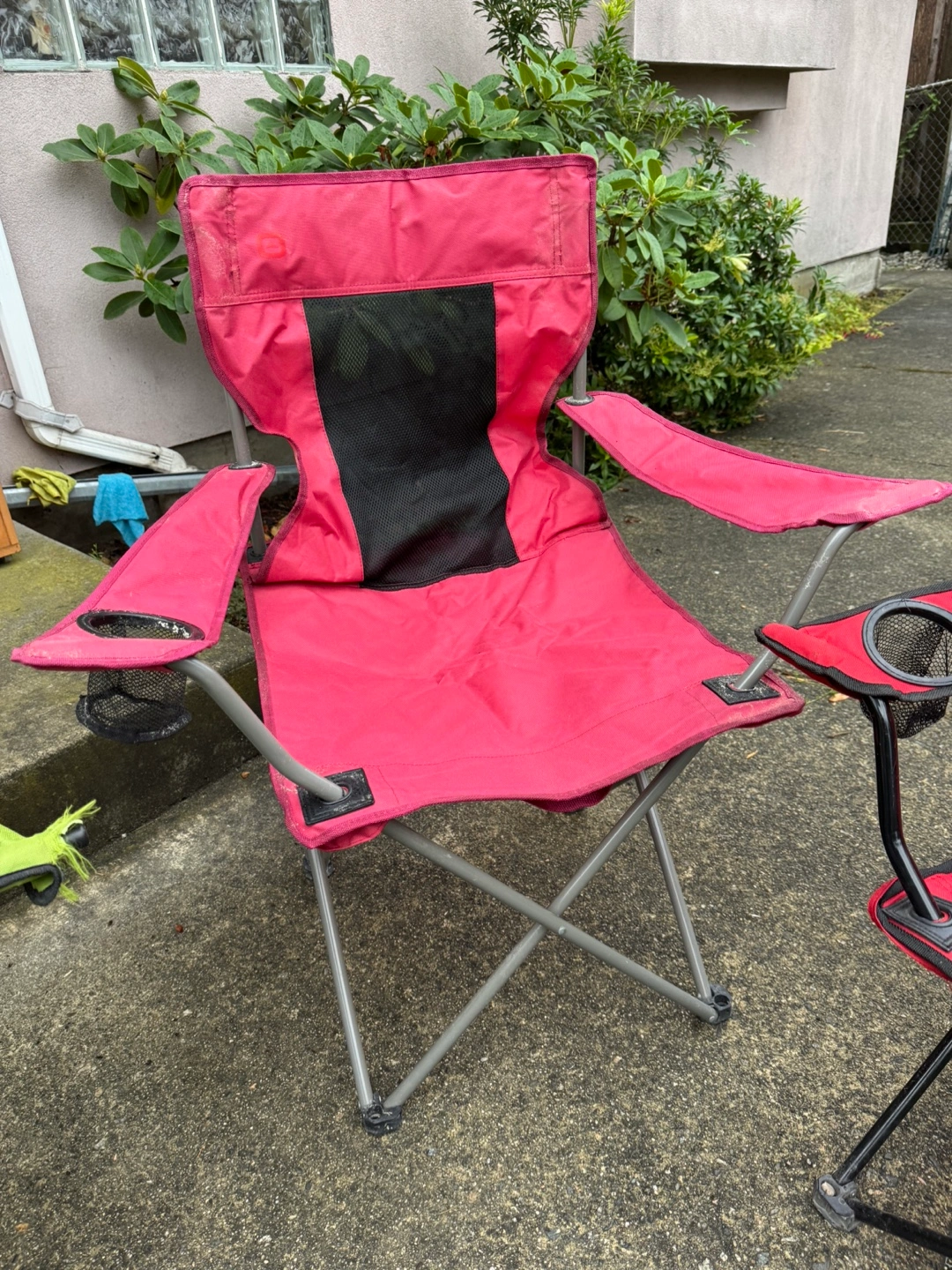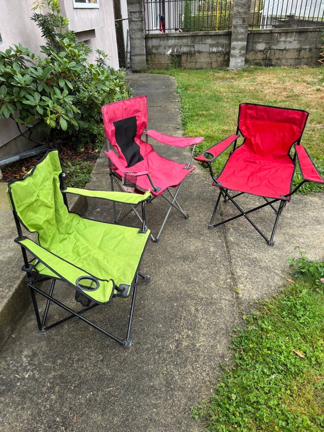 123Selling 4 camping chairs! There's a green one, a red one, a pink one and a blue one.The green chair has some wear and tear on the armrest, as shown in the photos. Pick up only