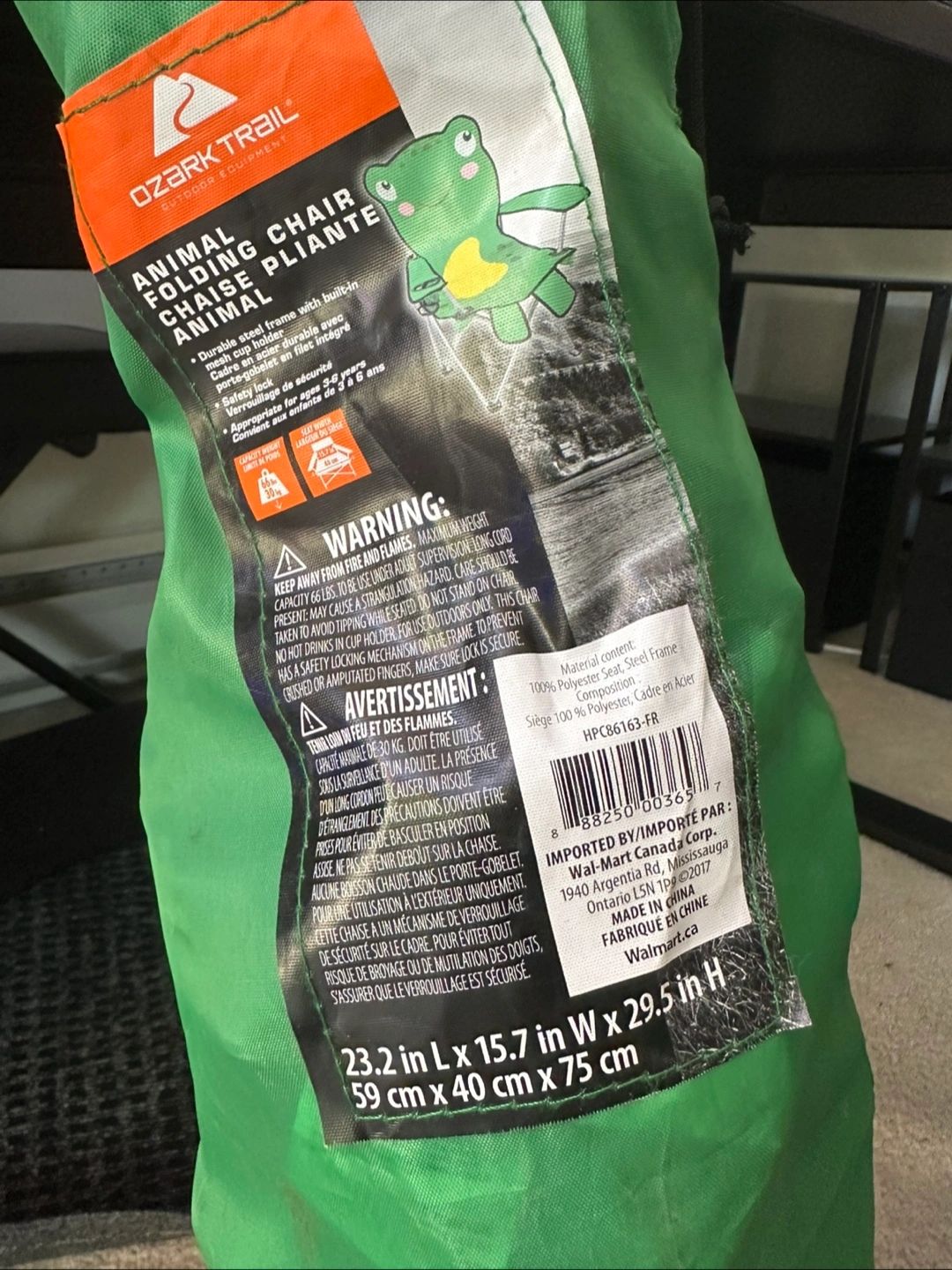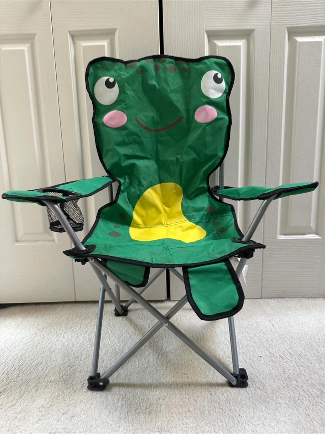 10This frog folding chair features a durable steel frame with a built-in cup holder. Dimensions: 23.2 in L x 15.7 in W x 29.5 in H (59 cm x 40 cm x 75 cm) Pickup available nearby.