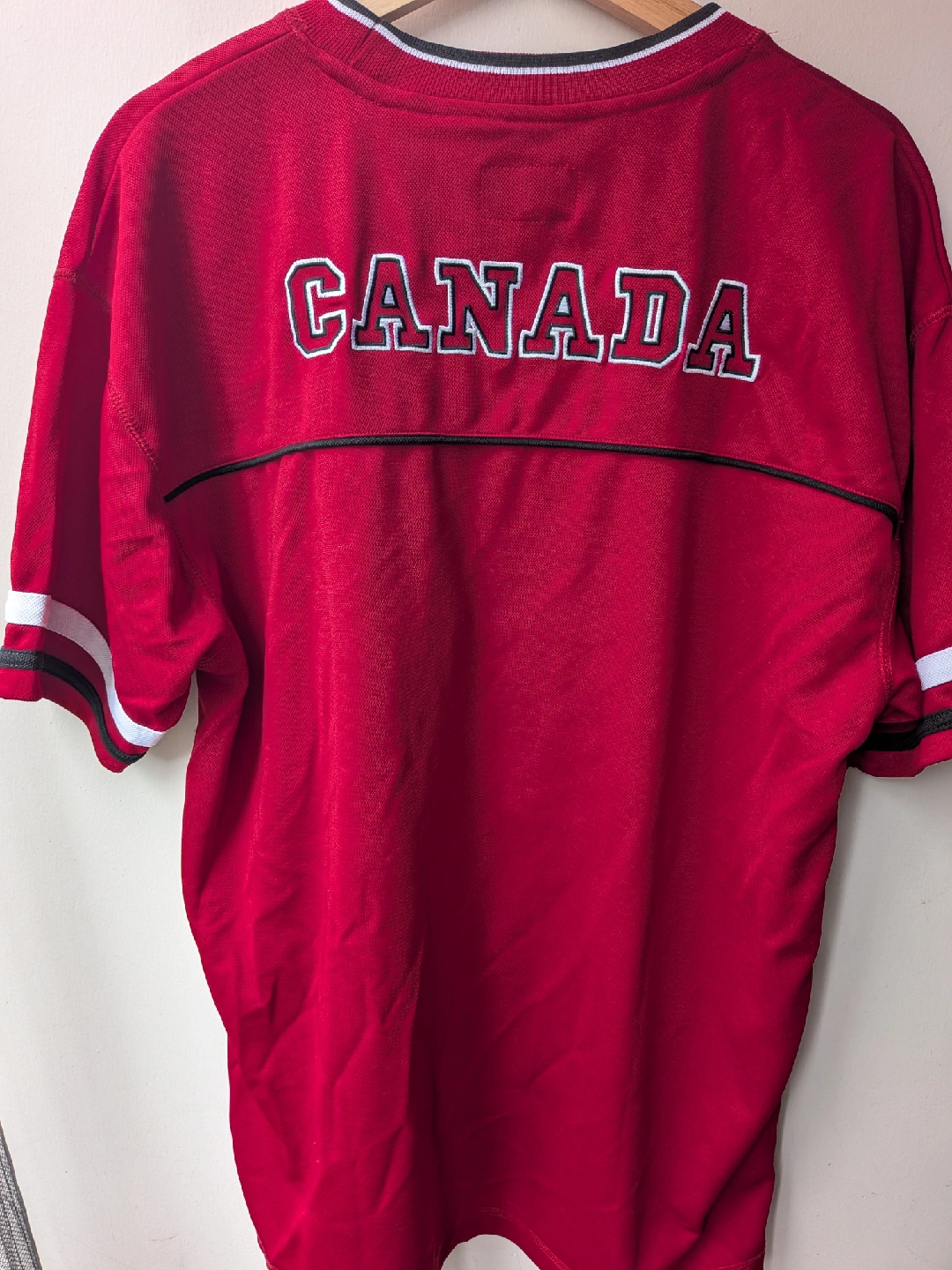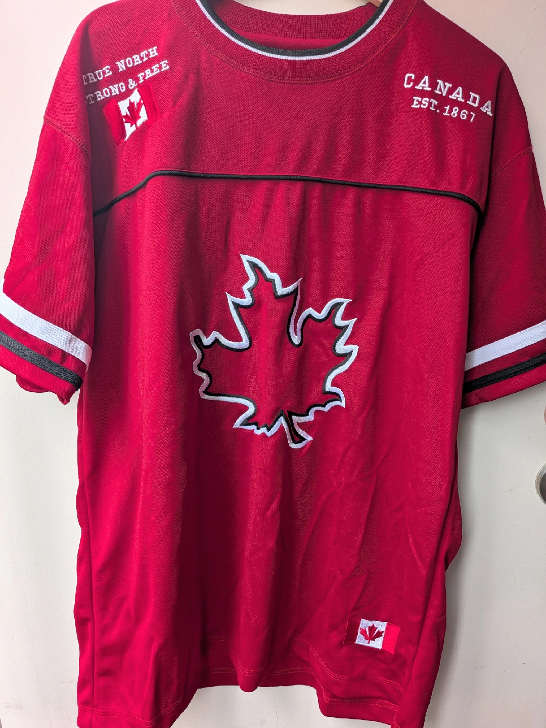 157Selling a red Canada Est. 1867 Jersey. It features a maple leaf design and the words 'True North Strong & Free' with a Canadian flag patch. Perfect for showing off your Canadian pride! Very good used condition. No issues Cash only, No etransfers Location: Etobicoke. Rathburn Rd and Renforth dr. Etobicoke Olympium nearby. I cannot meet outside this area No holds, first come, first serve