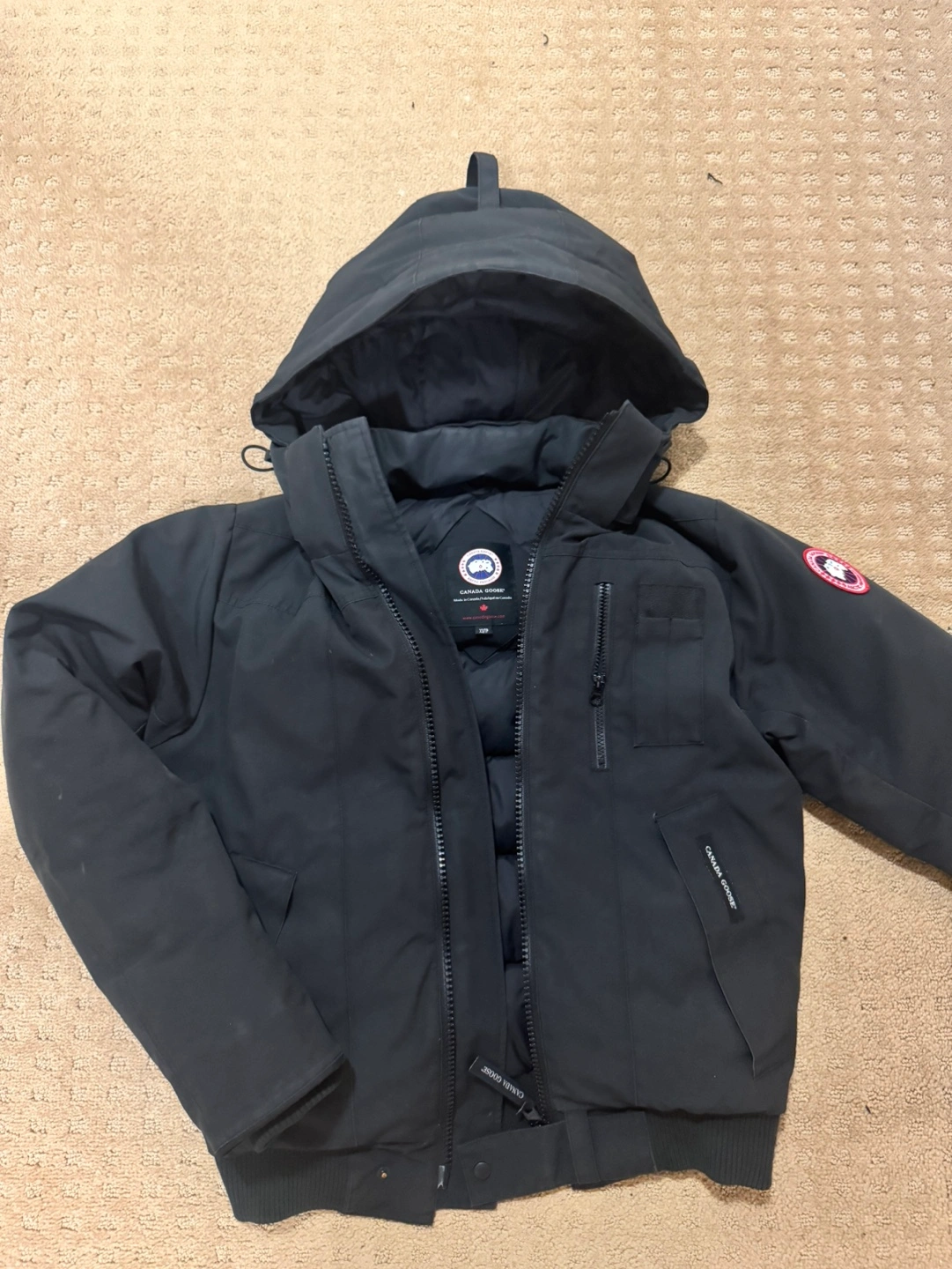 Black Canada Goose bomber jacket. Features a hood, zipper closure, and ribbed cuffs. Multiple pockets. Excellent winter wear.