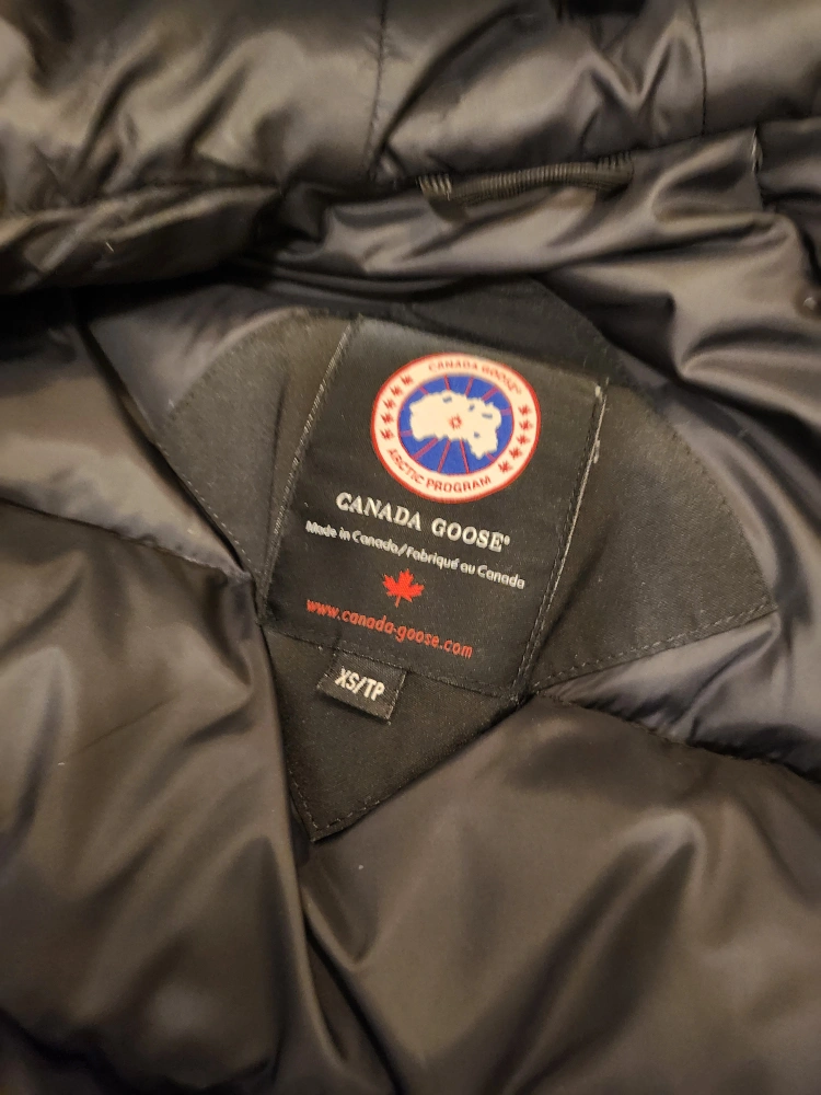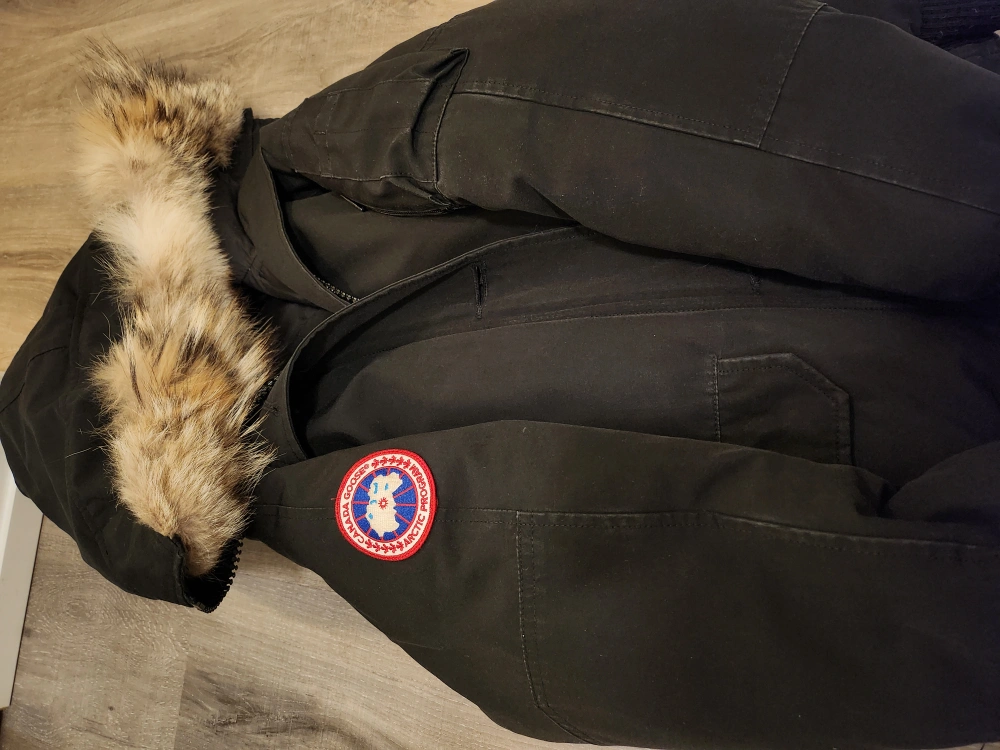 731Black bomber jacket with fur-trimmed hood. Size XS/TP.