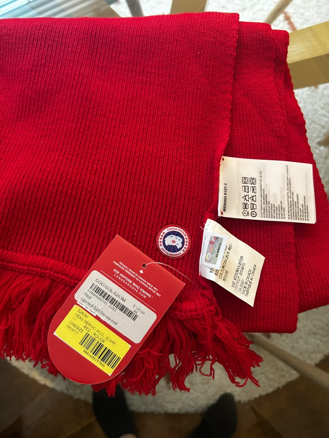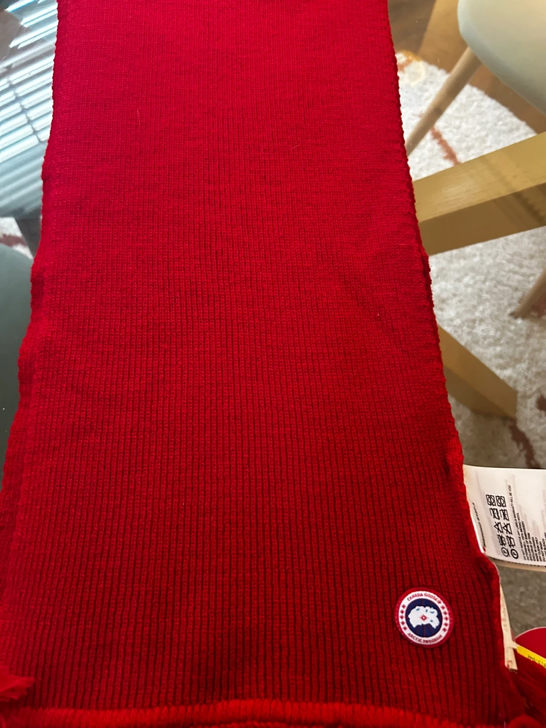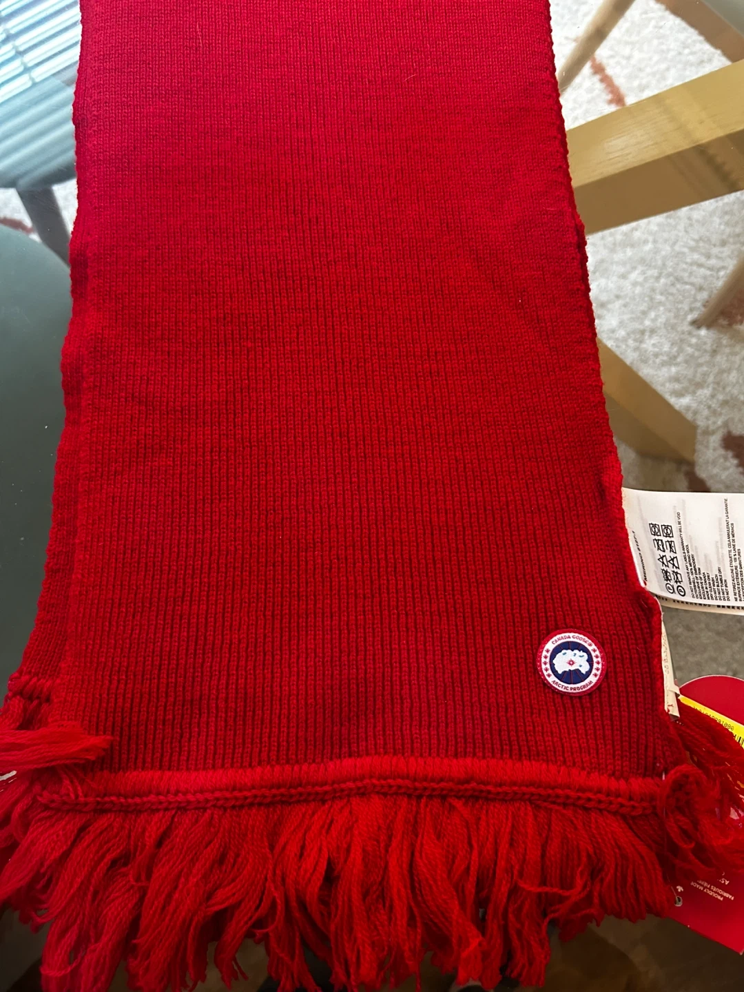 26Keep warm with this stylish Canada Goose merino wool scarf! It's a vibrant red colour and made of 100% merino wool. The scarf is brand new and originally retailed for $125