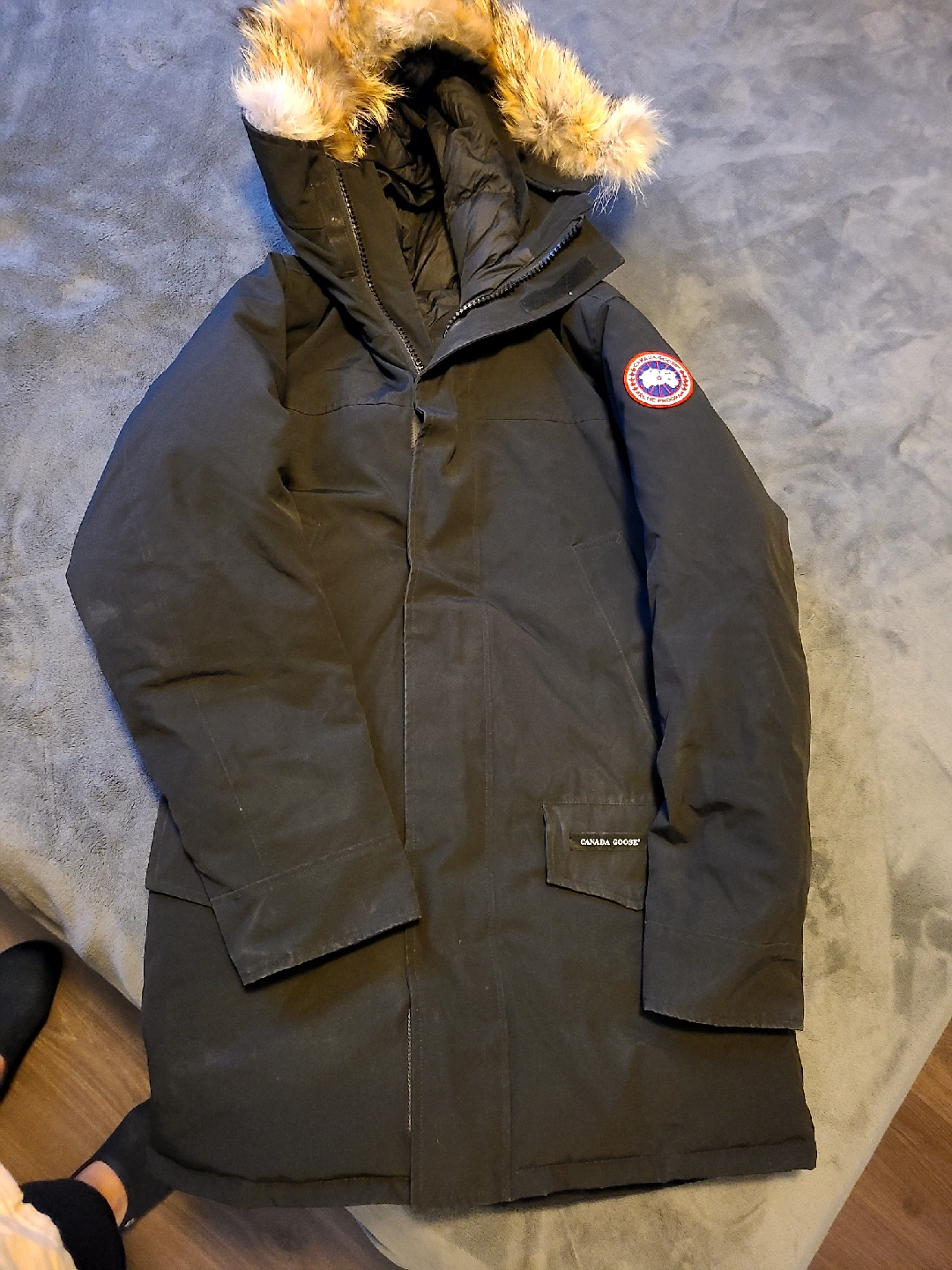 10Selling a Canada Goose parka in black. It's in great condition and ready for the cold weather! The jacket features the classic Canada Goose logo patch on the arm and a fur-trimmed hood.