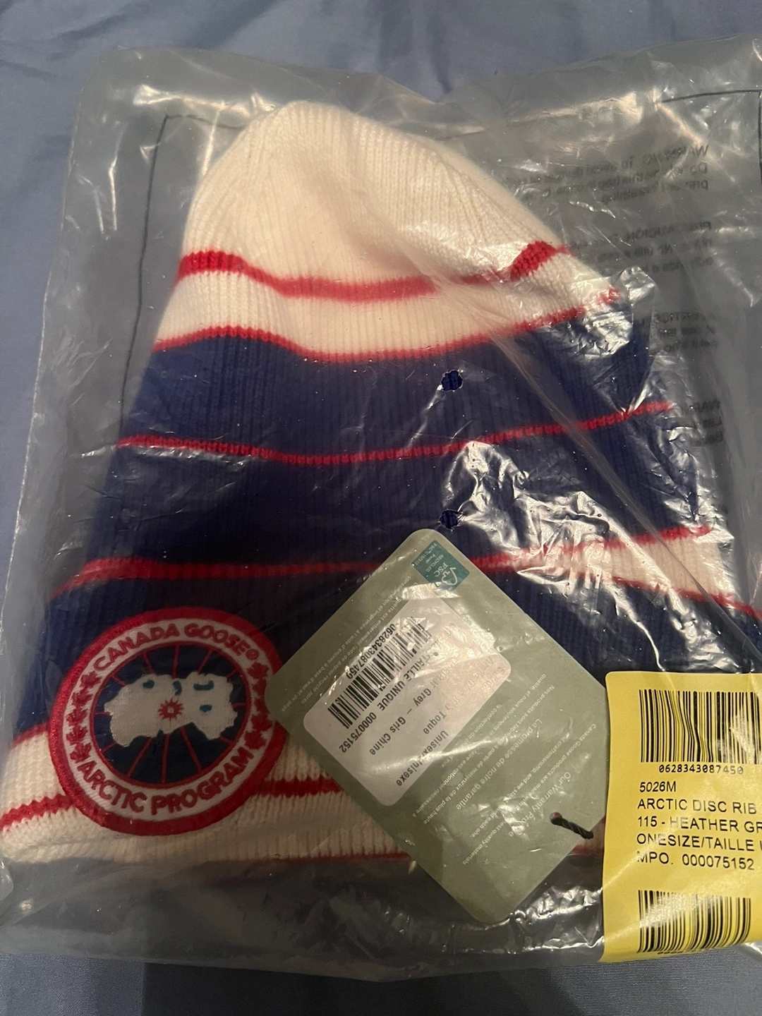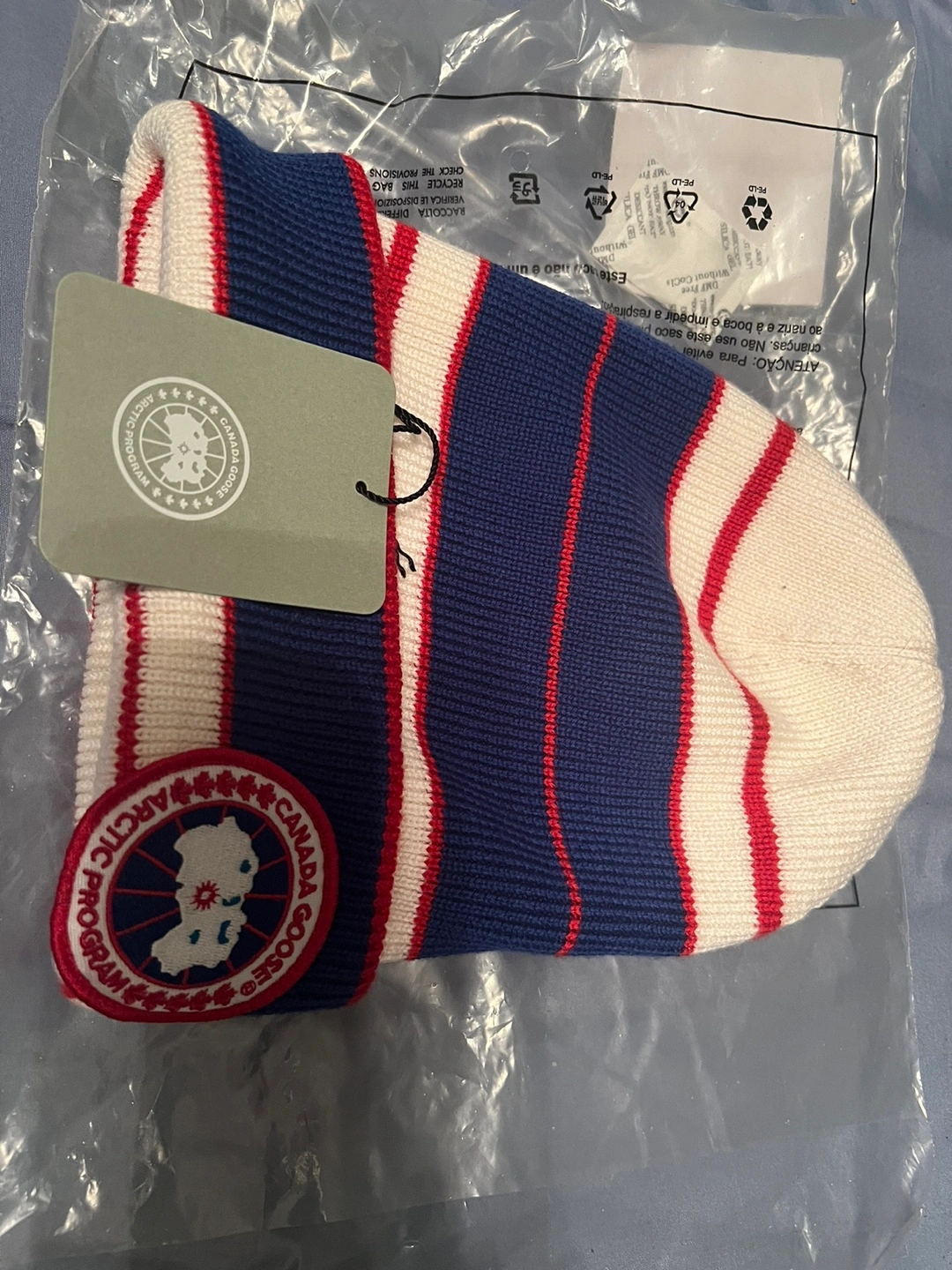 406Striped beanie with red, blue, and white stripes. Features a Canada Goose logo patch. original price $250