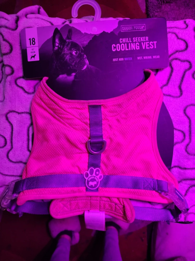 23Keep your furry friend cool with this Canada Pooch Chill Seeker Cooling Vest! It's a size 18 and designed to keep your dog comfortable in warm weather. Just add water, wring, and wear! Perfect for those hot summer days. This was used twice before she grew out of it.
