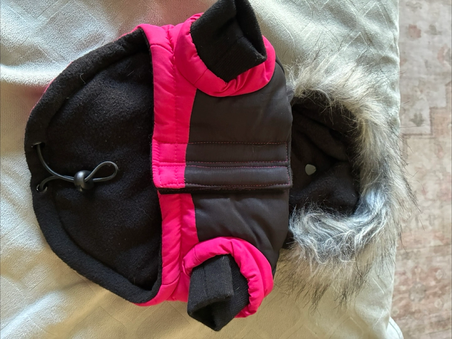 55A cozy winter parka for your furry friend. It has a hood with faux fur trim, two pockets, and elastic cuffs. Keep your dog warm and happy during their outdoor adventures.