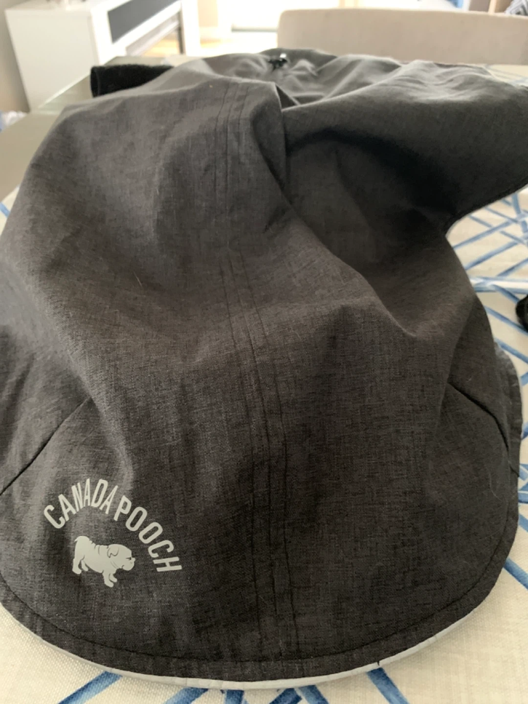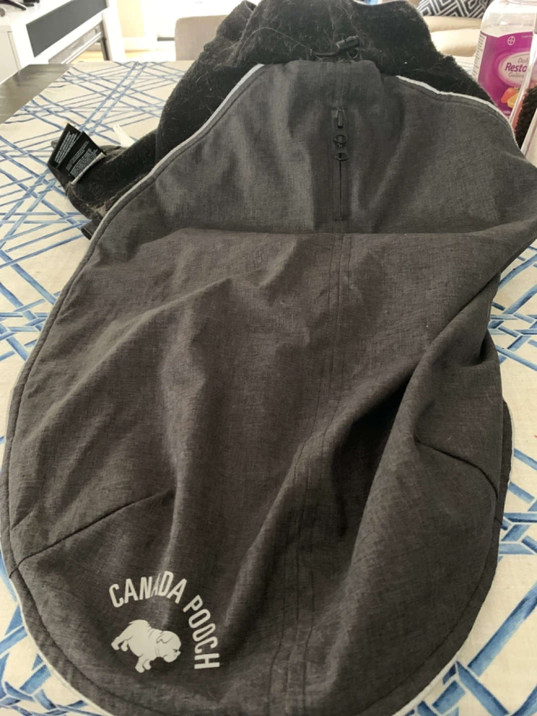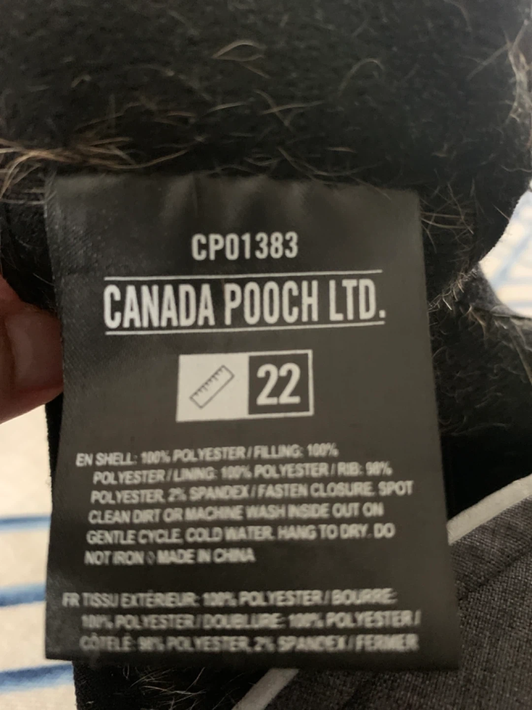 Size 22 for medium sized dog with long back. Gently used over a few seasons. Great for snowy walks and for short haired dogs that might get cold. Can also be used for rainy walks. Slips over the head and then snaps under the belly with ease. Has a zippered opening to put the leash through.