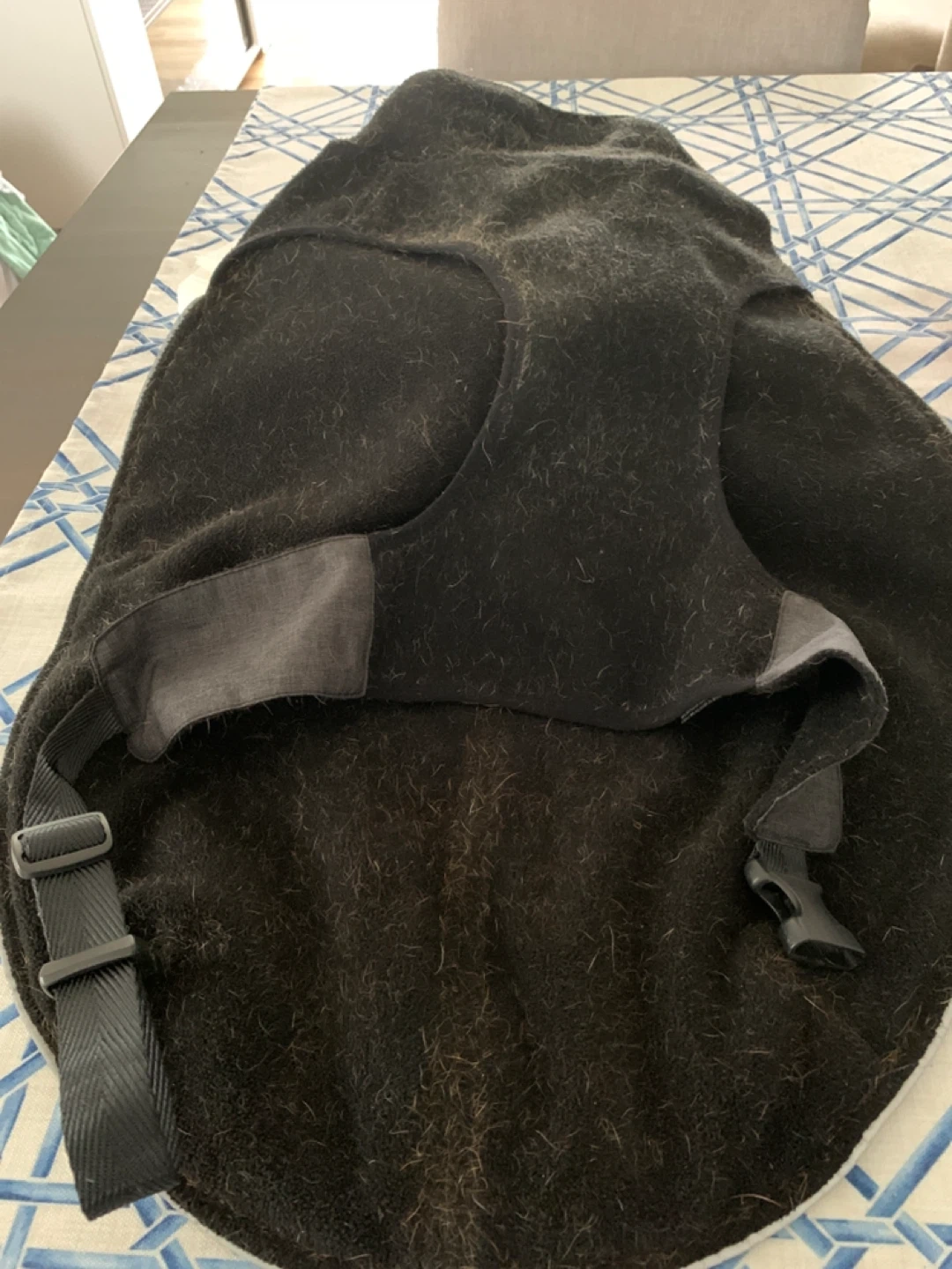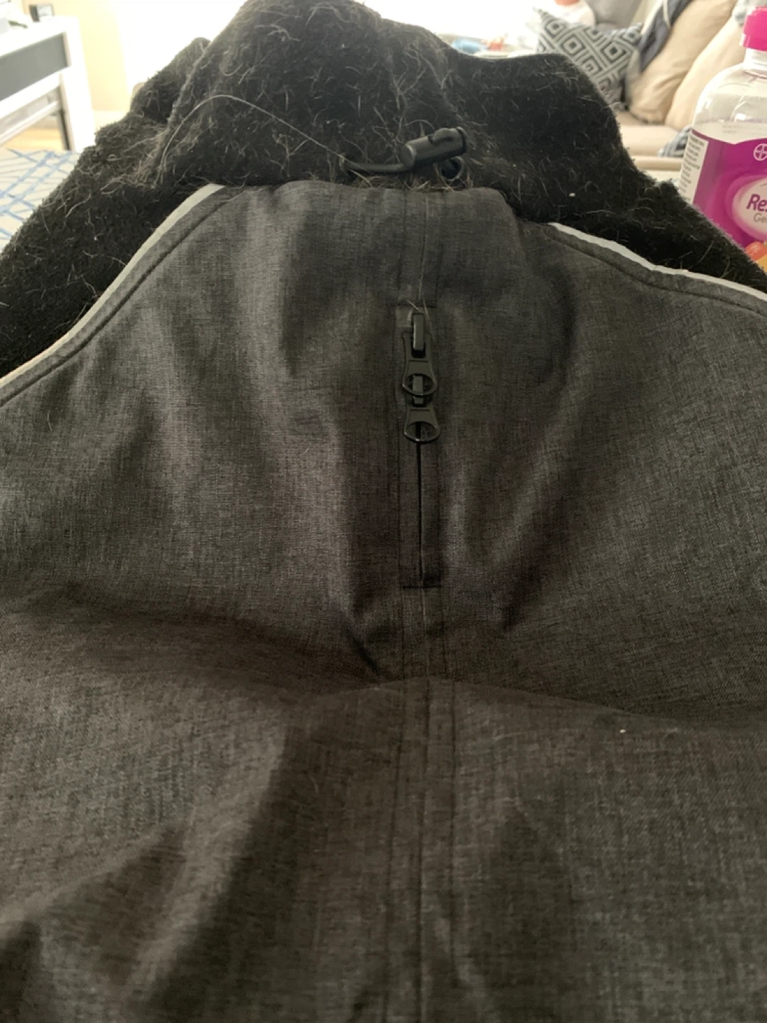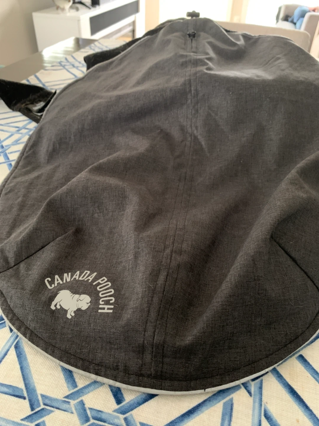 Size 22 for medium sized dog with long back. Gently used over a few seasons. Great for snowy walks and for short haired dogs that might get cold. Can also be used for rainy walks. Slips over the head and then snaps under the belly with ease. Has a zippered opening to put the leash through.