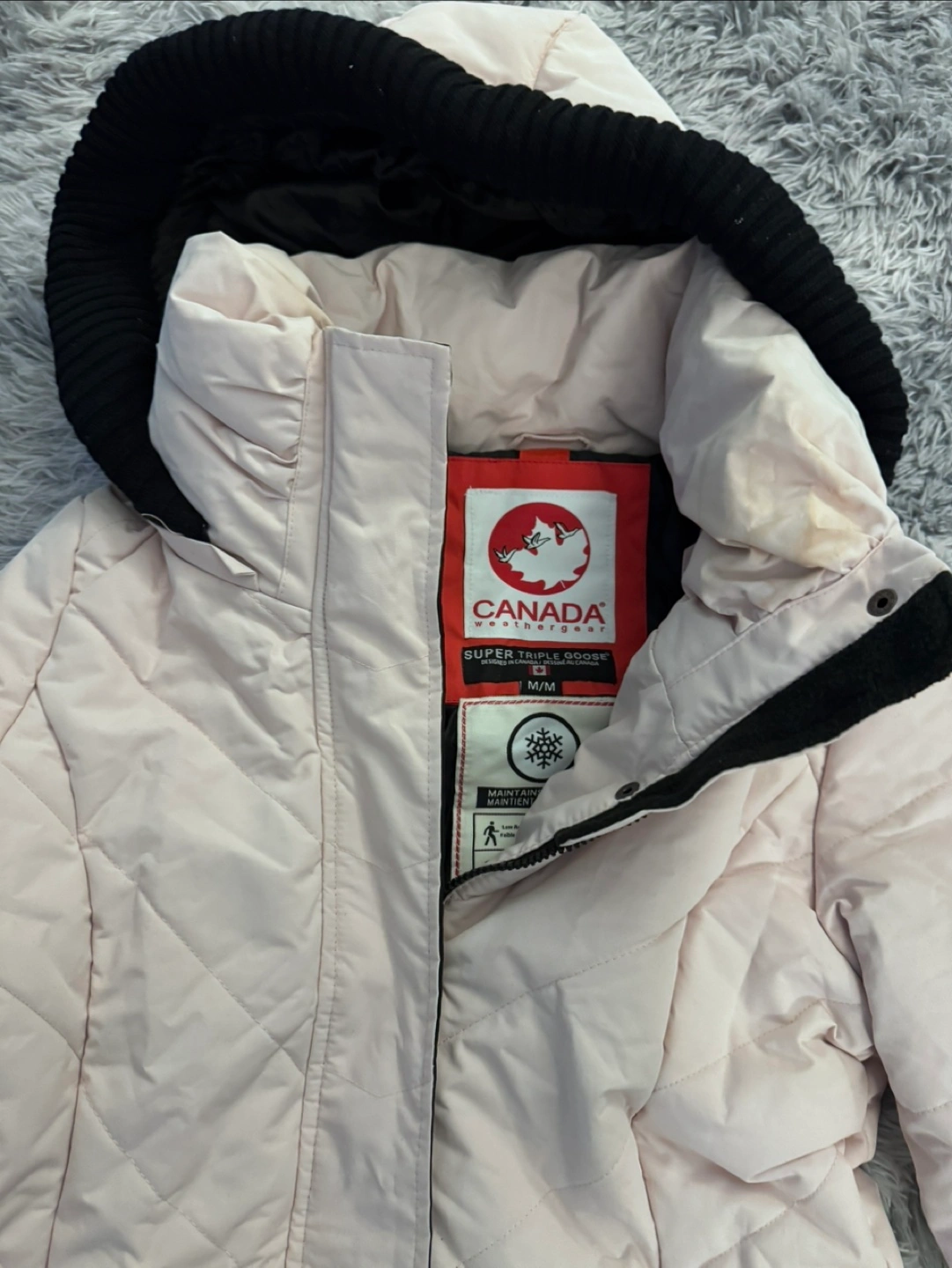 32Selling a Canada Weather Gear jacket in size medium. It's a light pink colour with a black hood and cuffs. The jacket is in great condition and ready for a new owner!