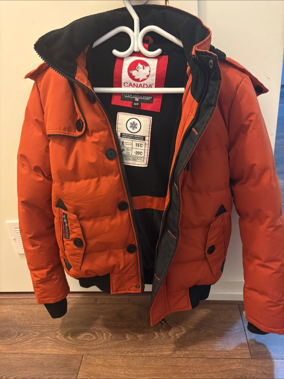 Cozy orange puffer jacket from Canada Weather Gear, perfect for staying warm during those chilly Canadian winters! It's a size S/P and features a stylish design with a comfortable fit. It's rated for temperatures between 15C and -20C