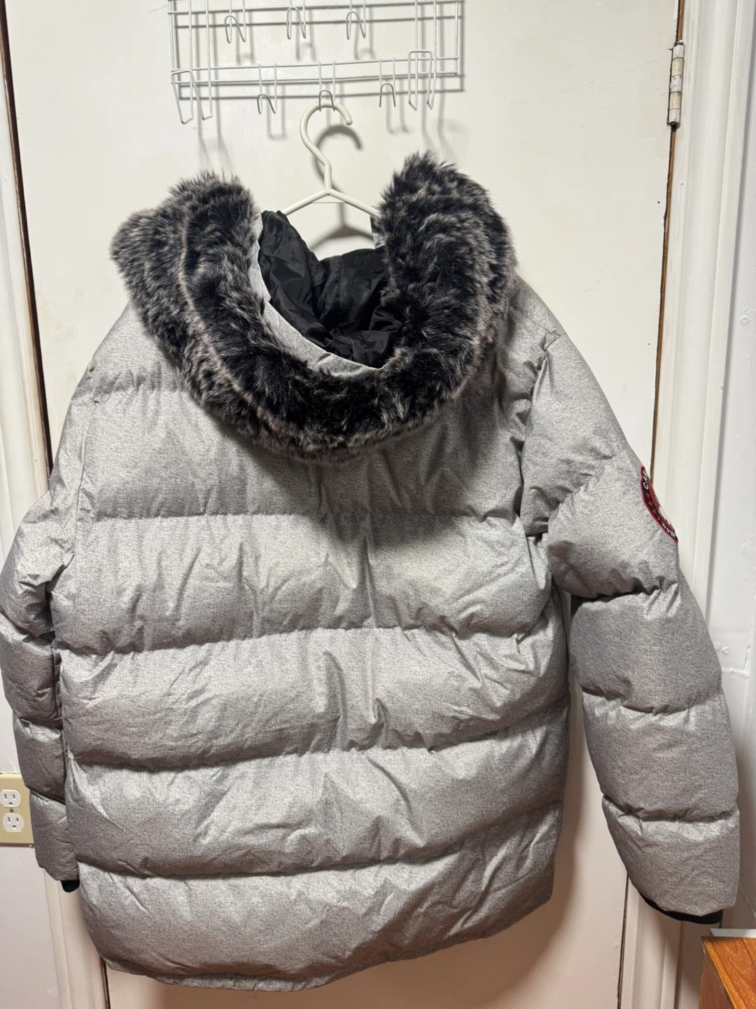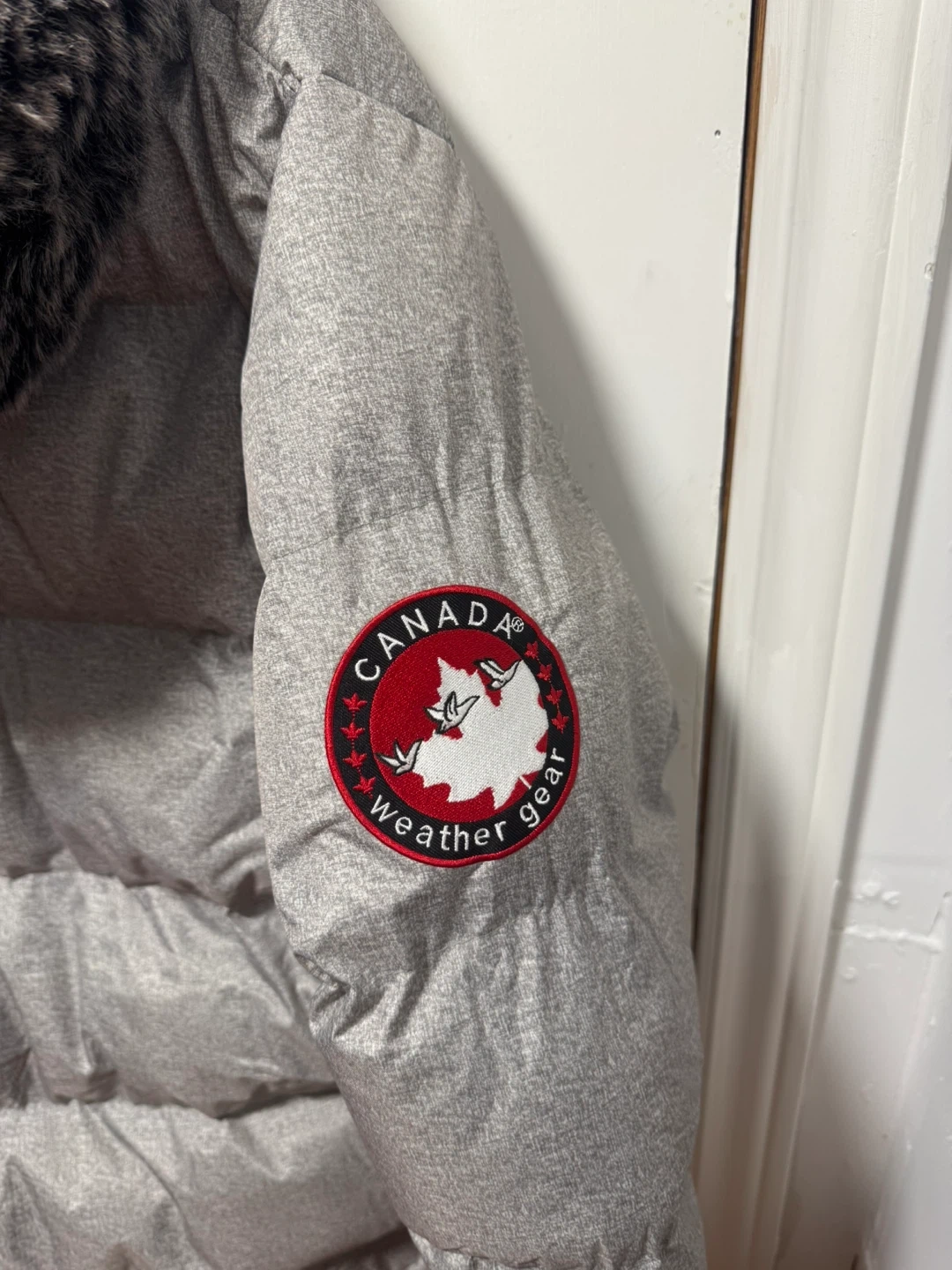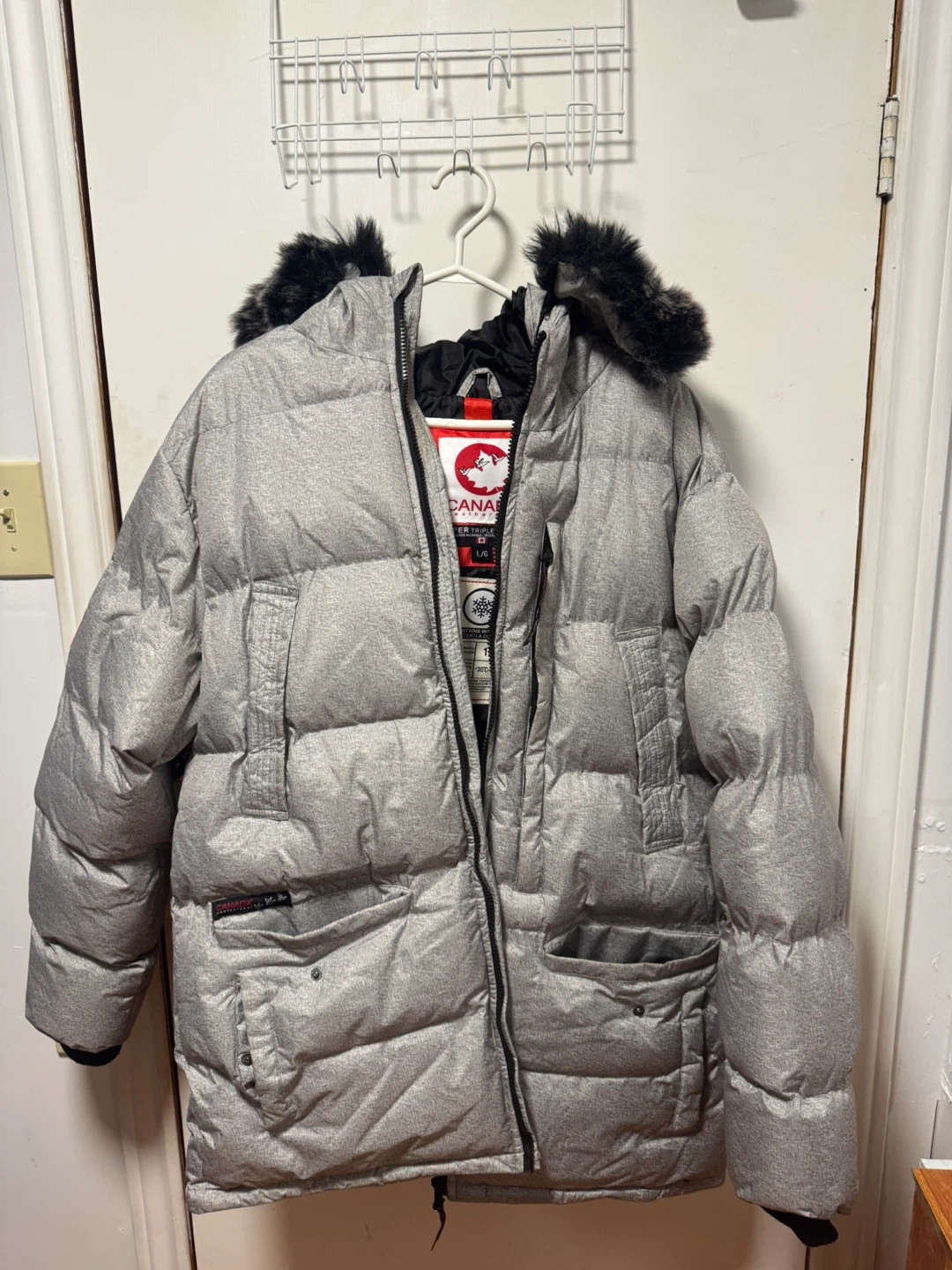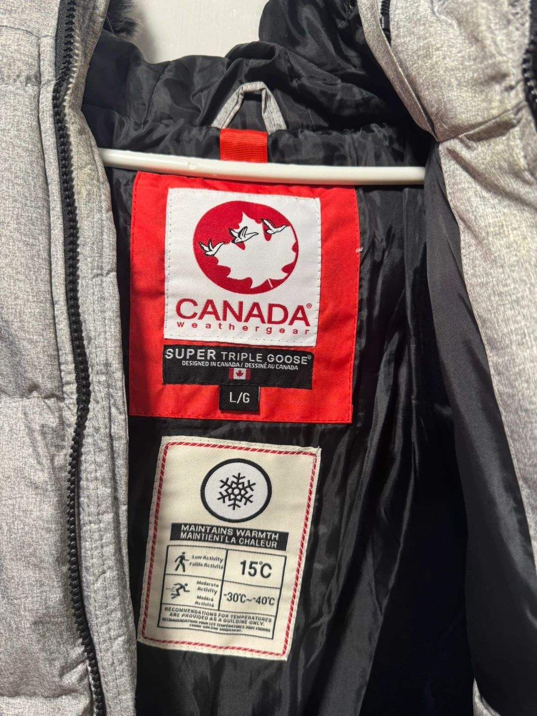 10Canada Weather Gear Super Triple Goose puffer jacket in size L! It's a stylish and warm jacket, perfect for cold weather. The jacket features a faux fur-trimmed hood. My husband bought and used seldom only..too bulky for him..just need to be wash