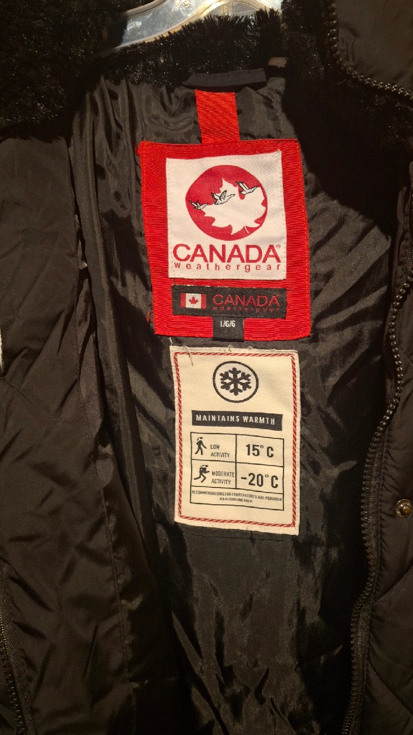 Selling a Canada Weathergear winter coat in black, size L. It's in great condition and ready to keep you warm this winter! The coat is designed to maintain warmth even in low activity at 15°C and moderate activity at -20°C.
