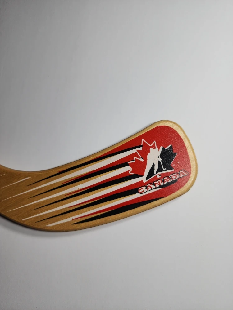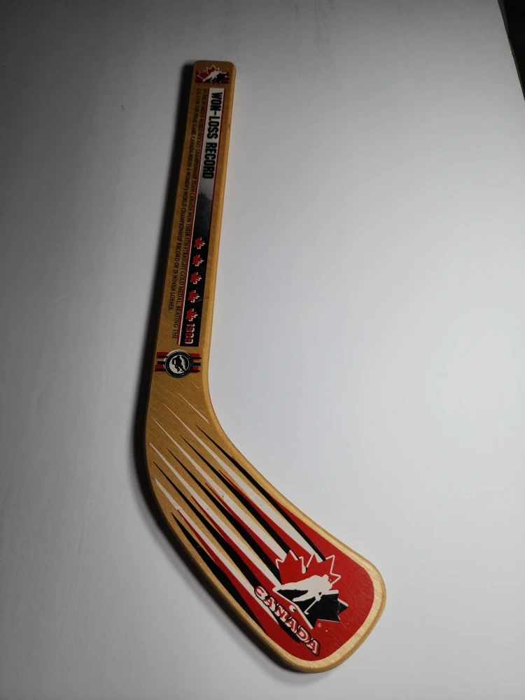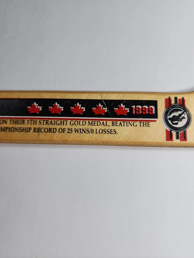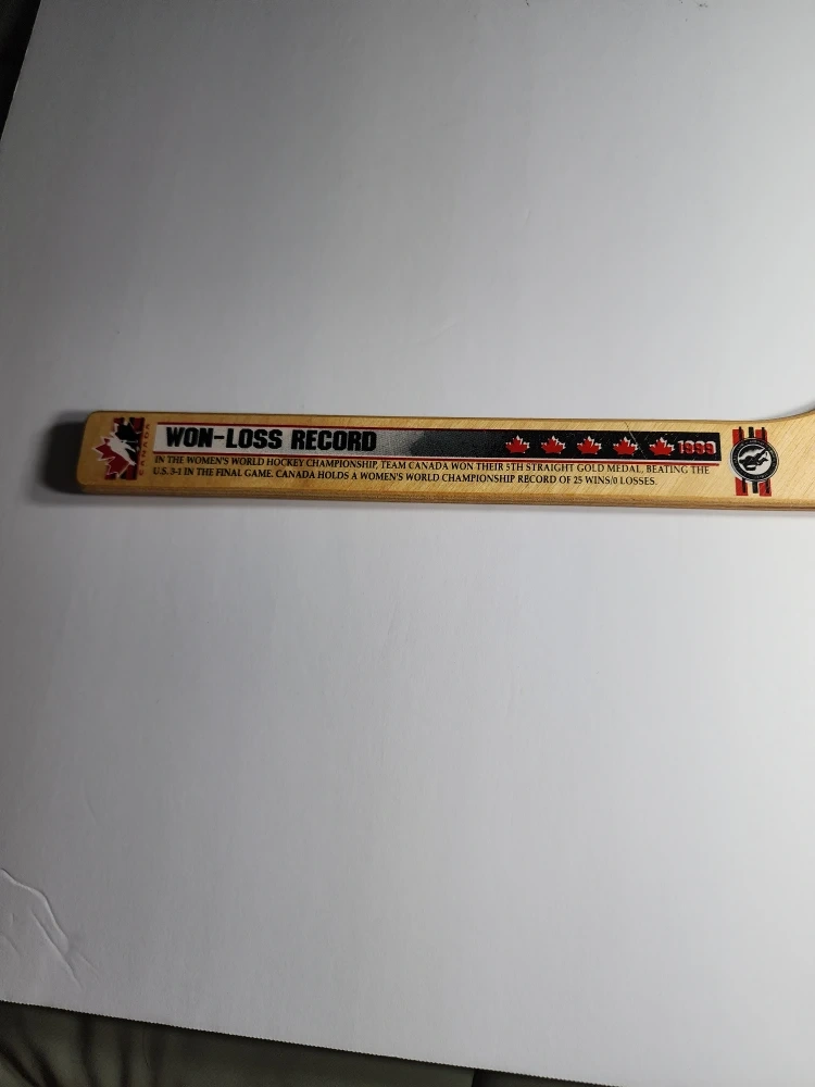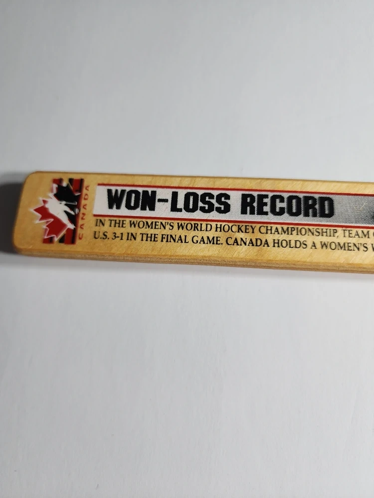 137Selling a mini hockey stick commemorating Canada's Women's World Hockey Championship wins. It shows the team's won-loss record and the 1999 win.