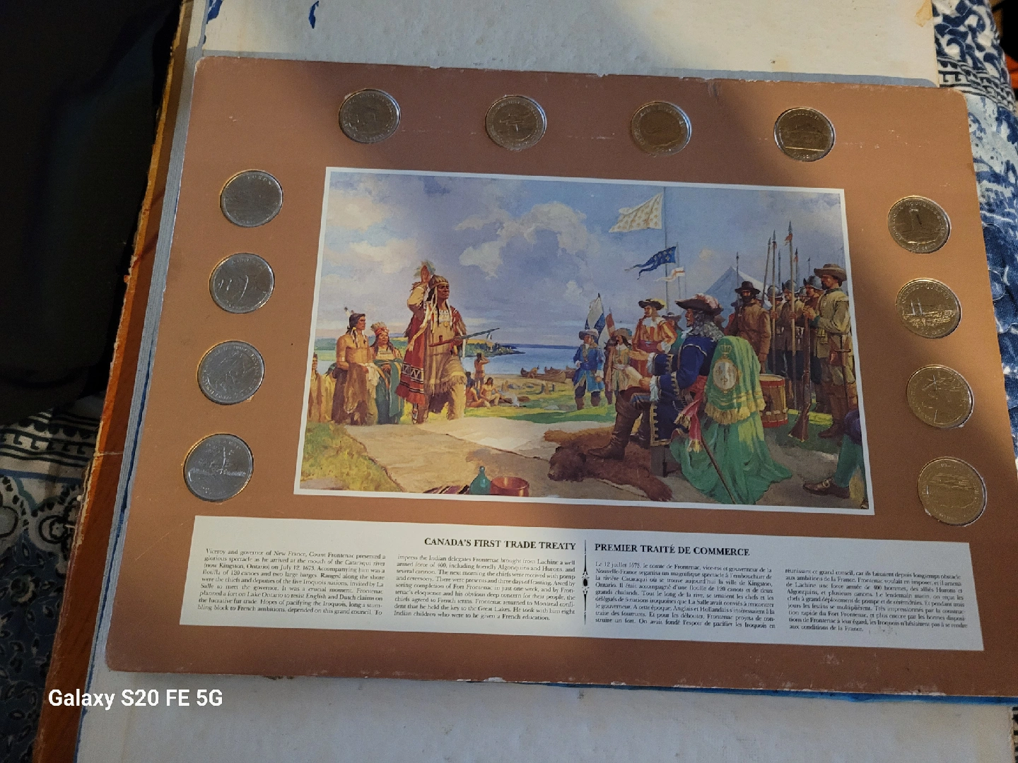 This is a commemorative coin collection depicting Canada's First Trade Treaty. It features imagery of the meeting between Count Frontenac and Indigenous leaders. A unique piece of Canadian history!