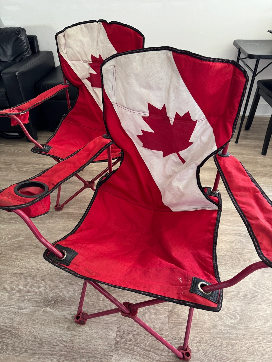 Selling a set of two folding camp chairs. They show some signs of use, as you can see in the photos, but are still strong, slightly heavy compared to other chairs and perfectly functional for camping, picnics, or just chilling in the backyard.