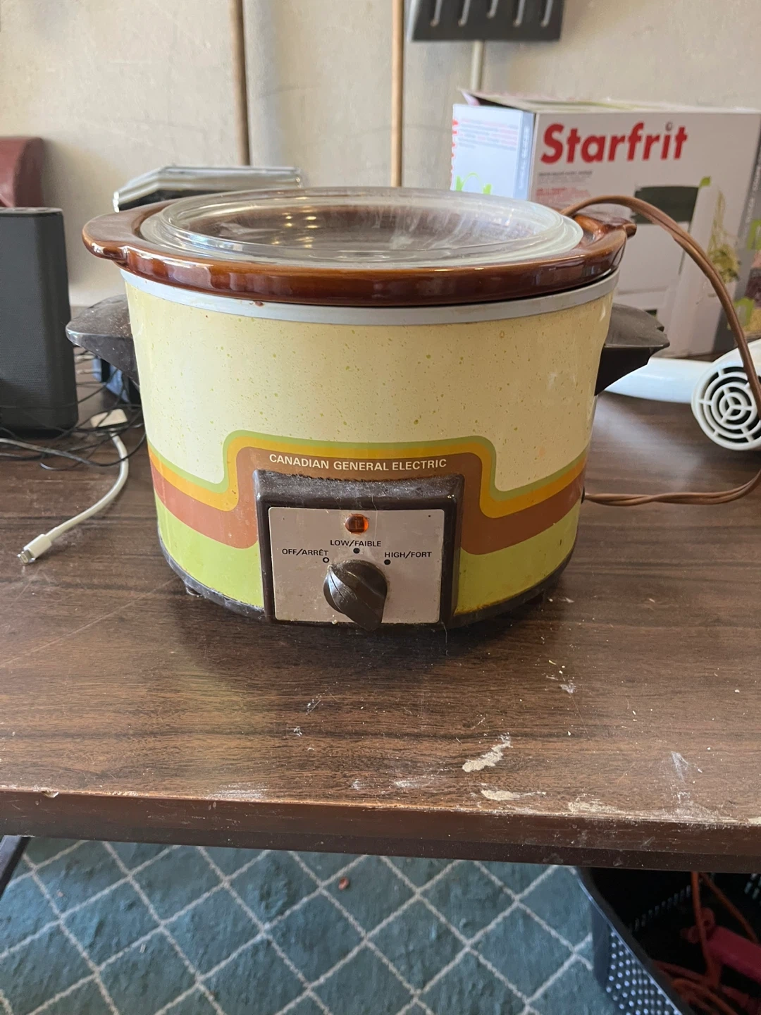 Vintage Canadian General Electric crock pot. It has a low/fable and high/fort setting. Perfect for making soups, stews, and other delicious meals! It is in good working condition.