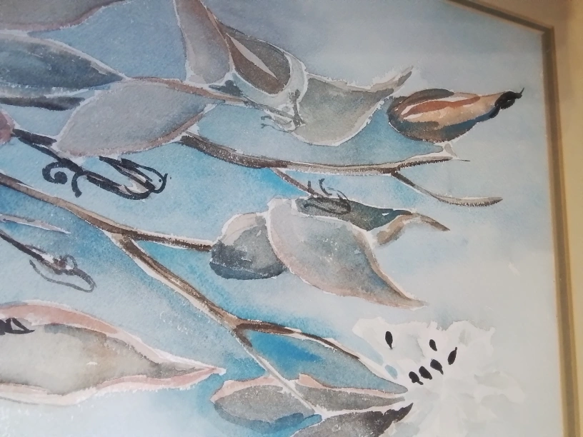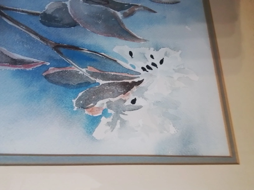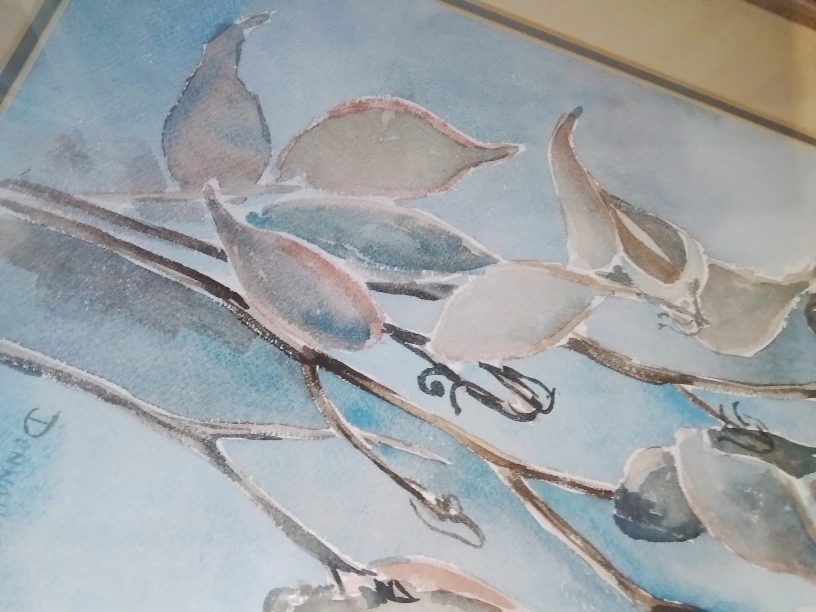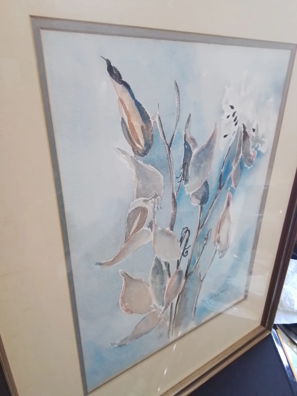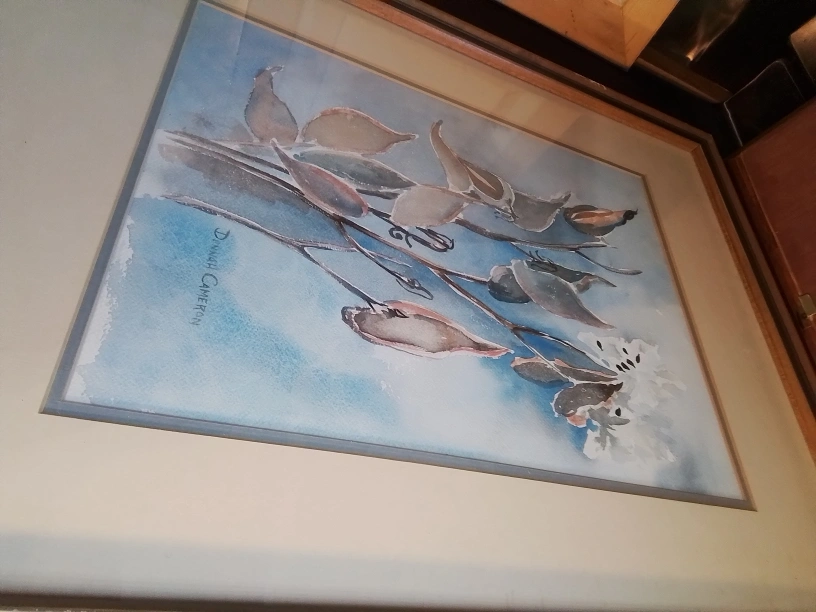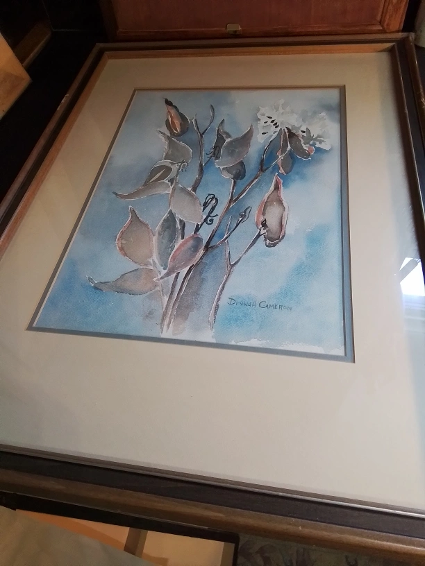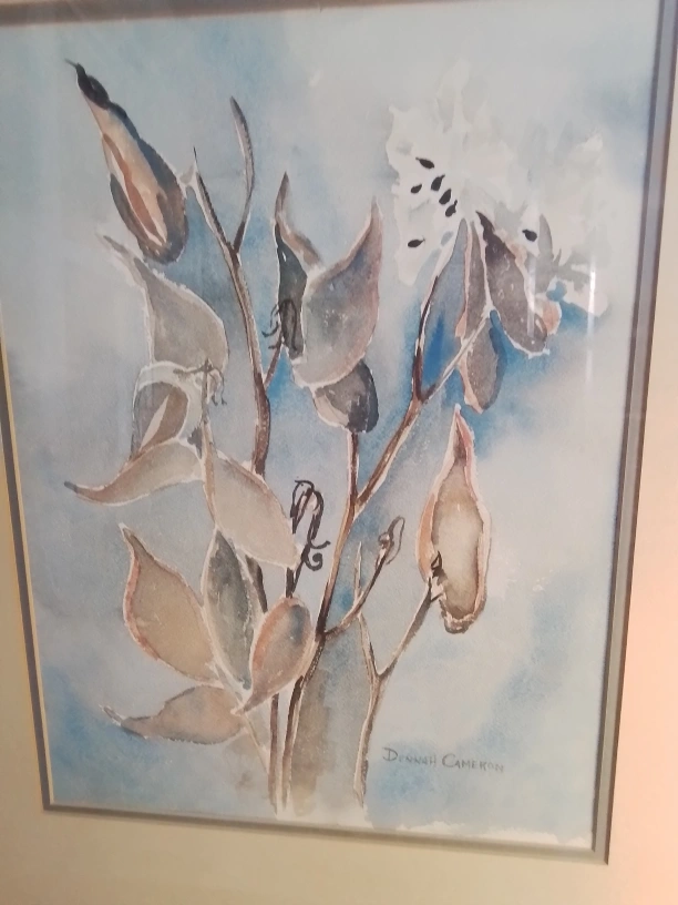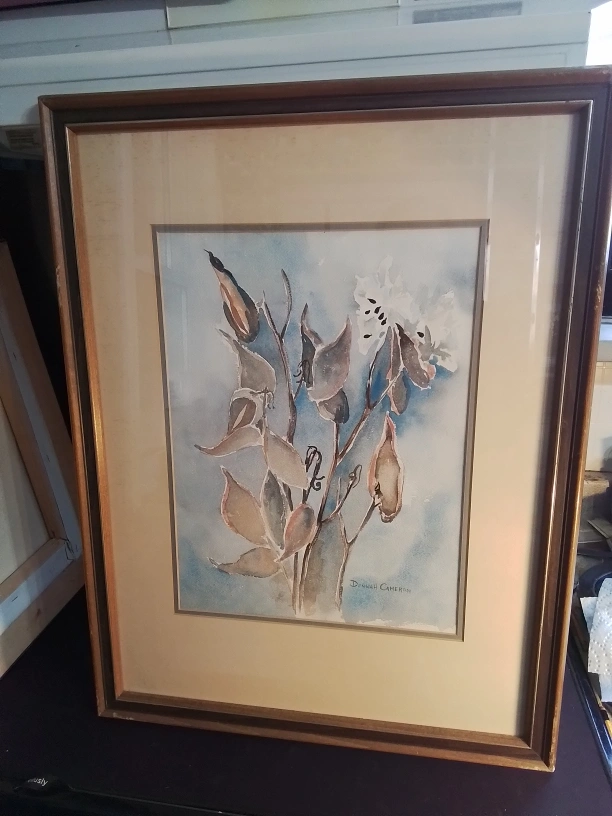 Canadian WC on Paper Signed Donnah Cameron Framed Watercolor Painting of Flowers by Donna Cameron Original watercolor painting. Framed. Features muted colours and floral theme. Artist signature visible. Lovely addition to any home. Watercolor on paper, framed. The piece captures the delicate beauty of botanical elements, showcasing leaves and flowers rendered in soft hues of blue, brown, and white against a serene backdrop. Signed Donnah Cameron on both bottom right corner. 40 x 32 cm (15 3/4 x 12 1/2 inches), F: 67 x 50 cm (26 1/2 x 19 3/4 inches) Pickup at Young Street and Steels Ave