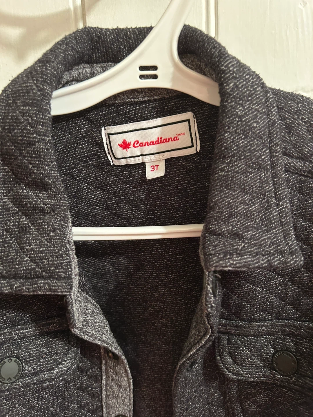 12Canadian brand. Snap button up grey quilted Shacket. Grey in colour. Size 3t. Brand new condition $10 Pickup Kincardine area or Peterborough but I can arrange delivery in port Elgin, walkerton-Durham, wingham-listowel-kw/cambridge/guelph, goderich-bayfield, & Arthur-Orangeville-Newmarket-Lindsay AREAS.