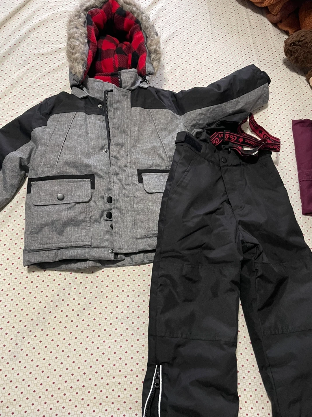 5Selling a Canadiana snowsuit in size 4T. It's grey and black, with a red and black plaid lining in the hood. Perfect for keeping your little one warm this winter!