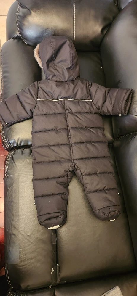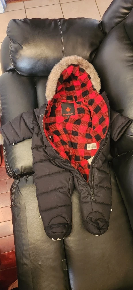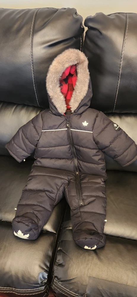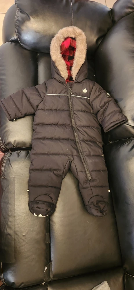 15Selling a Canadiana baby snowsuit. It's black with a red and black plaid interior and a faux fur trim on the hood. There are maple leaf details on the front and feet of the snowsuit. Perfect for keeping your little one warm this winter!