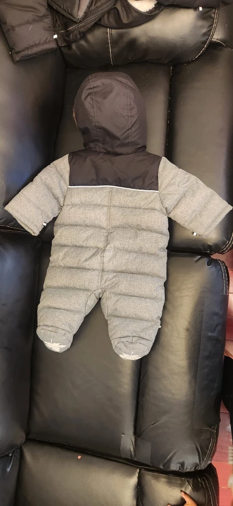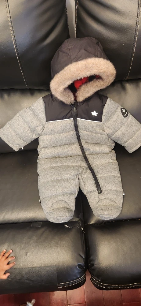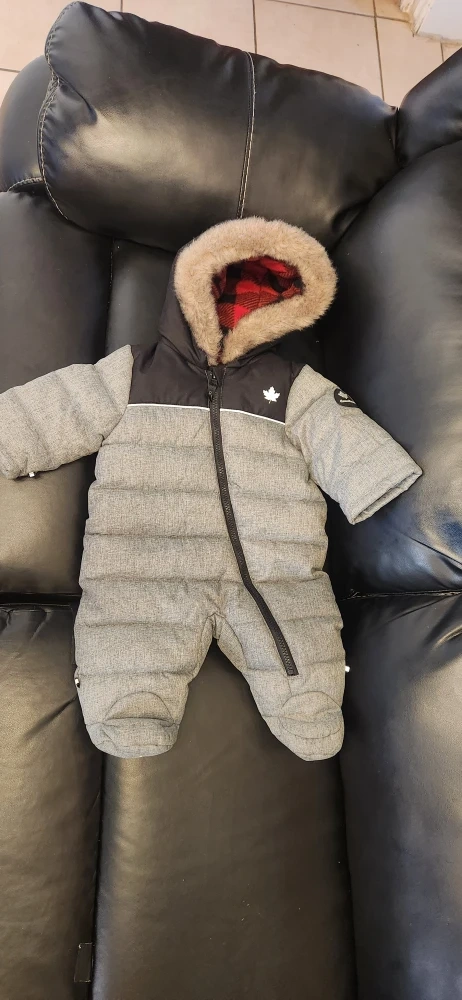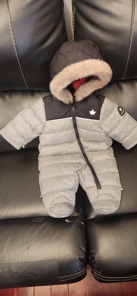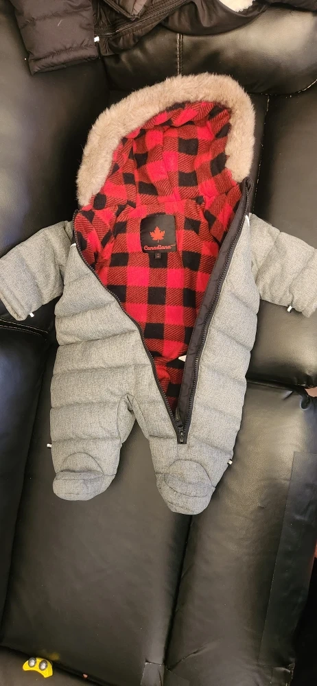 15A cozy Canadiana baby snowsuit, perfect for keeping your little one warm this winter! It's grey with a black upper section and a faux fur-trimmed hood. The inside is lined with a red and black buffalo plaid pattern. It has a maple leaf logo on the front.