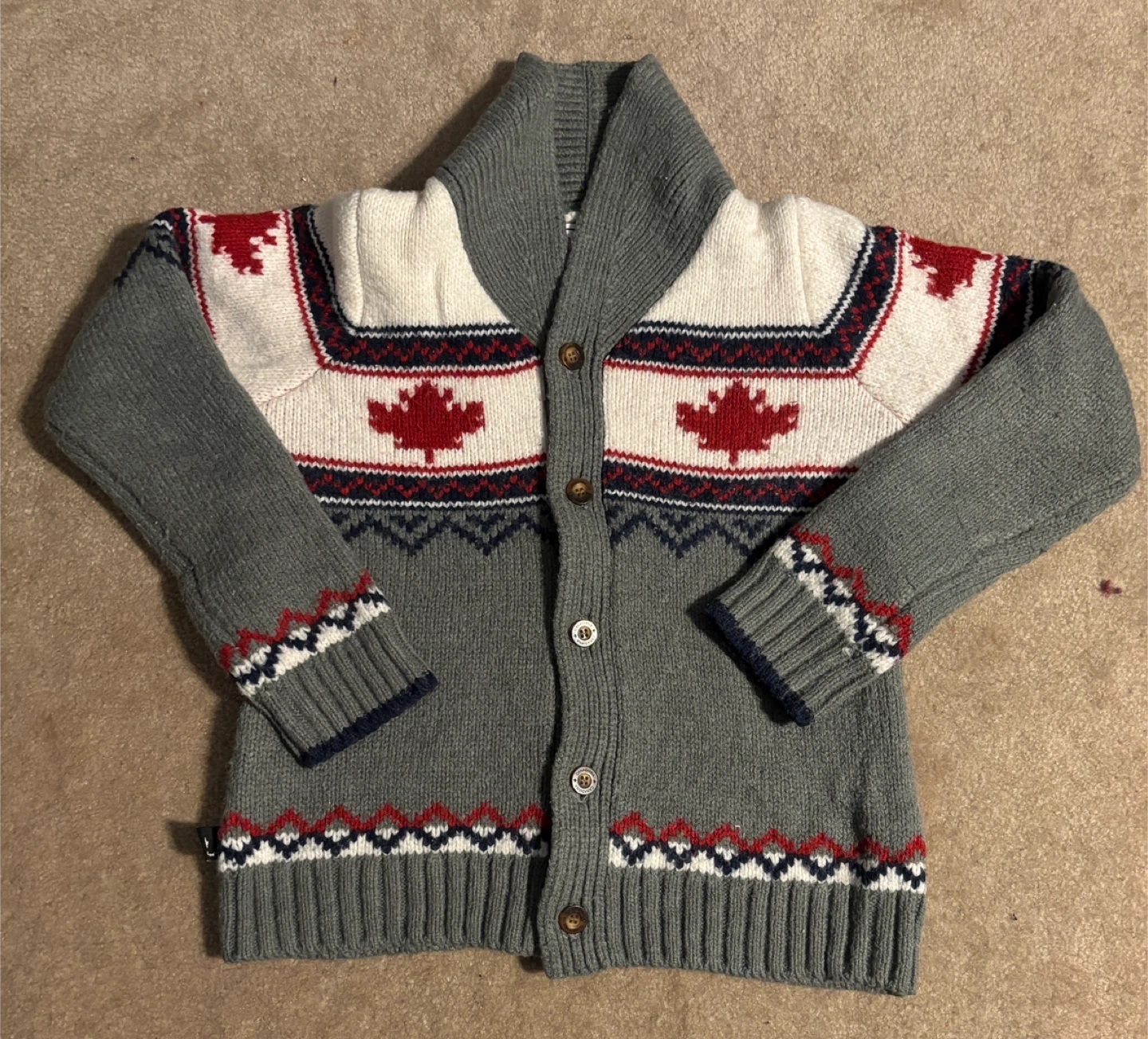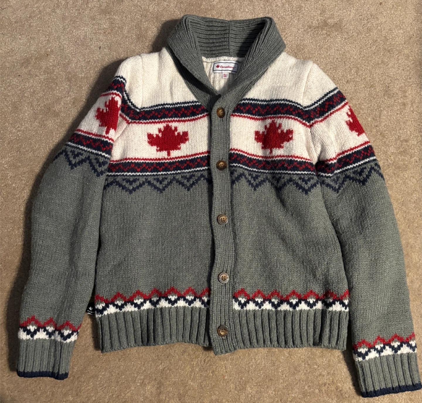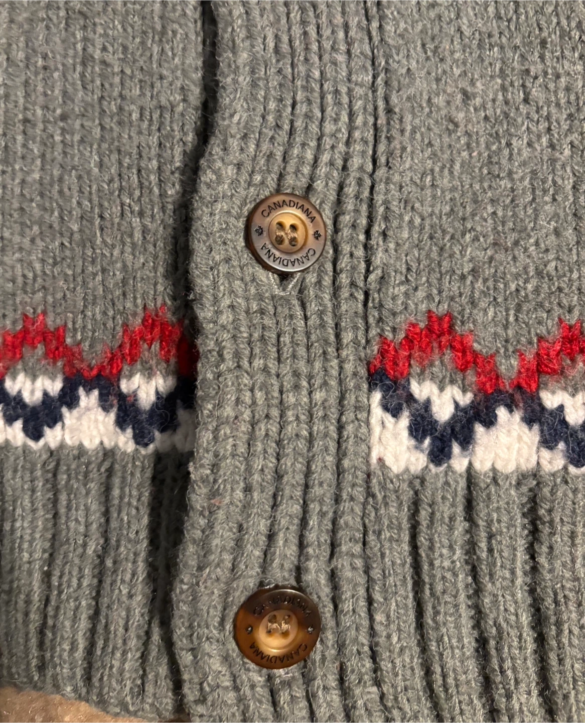 97Cozy Canadiana cardigan in size XL/TG! Measurements: waist 36” … length 21”. It features a grey and white colour scheme, complete with the iconic maple leaf design. Perfect for adding a touch of Canadian flair to your wardrobe
