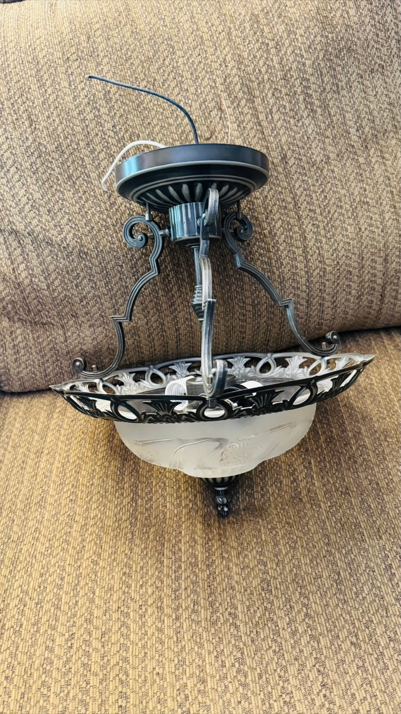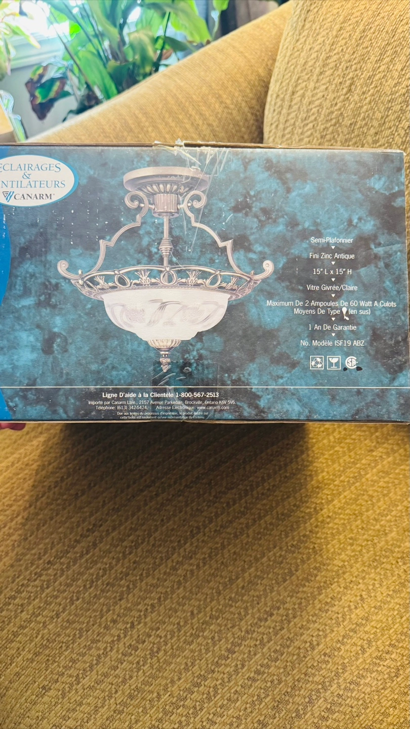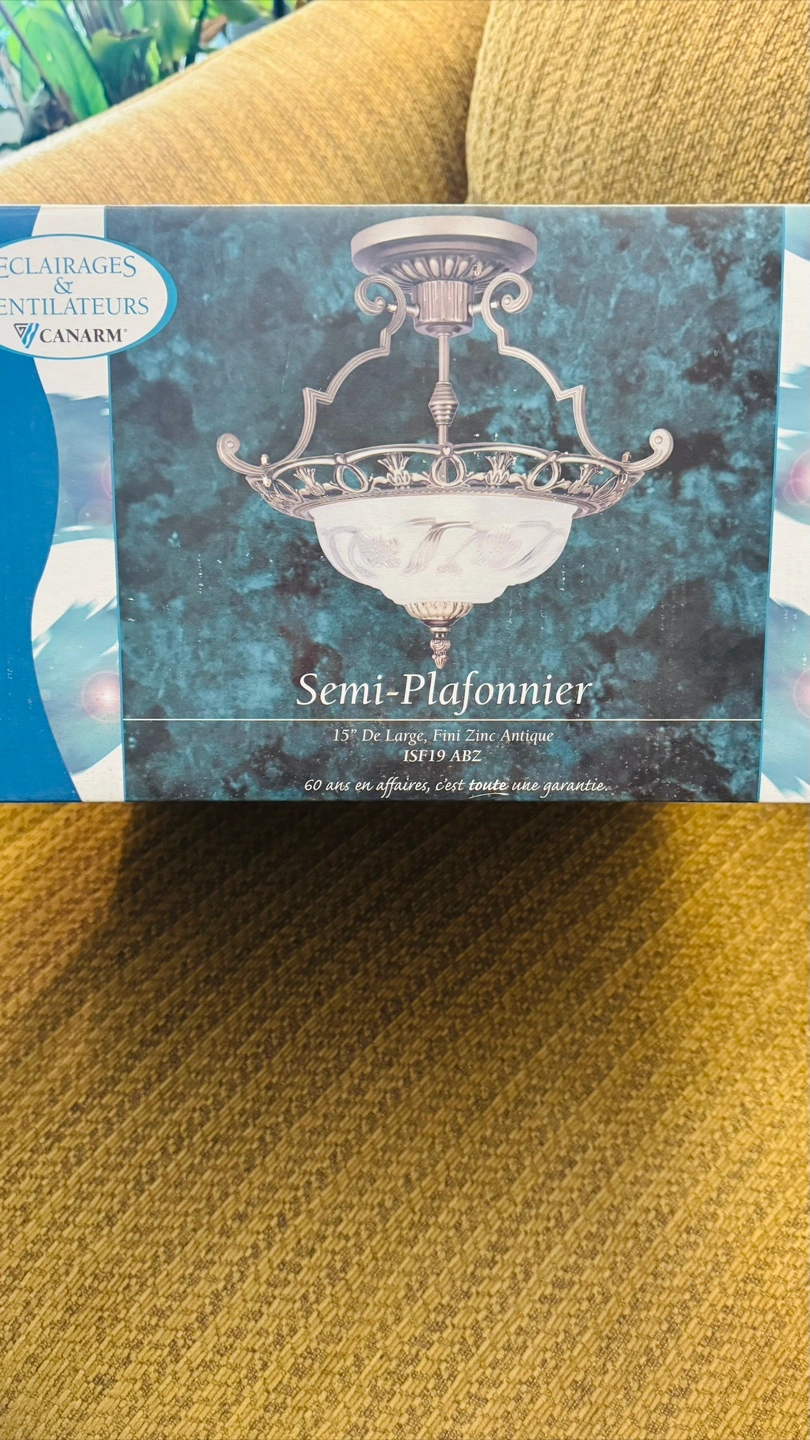 89Selling a CANARM Semi-Plafonnier in antique zinc finish. It's 15" x 15" in size. The glass is described as givree/claire. The box is included. It has a decorative zinc-tone metal frame and a frosted glass shade with floral accents. The fixture is in very good condition Total 5 units Semi-Flush@ 30.00$ each 1 flush mount light @ 15.00$