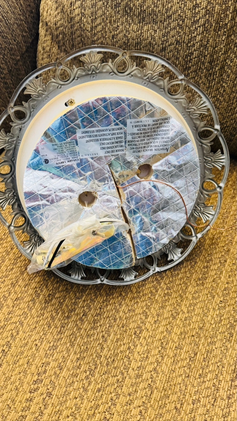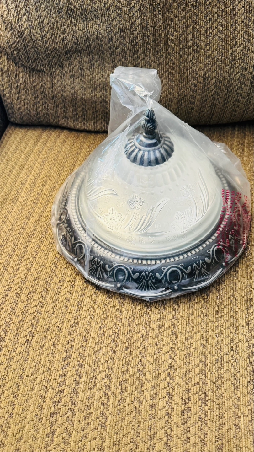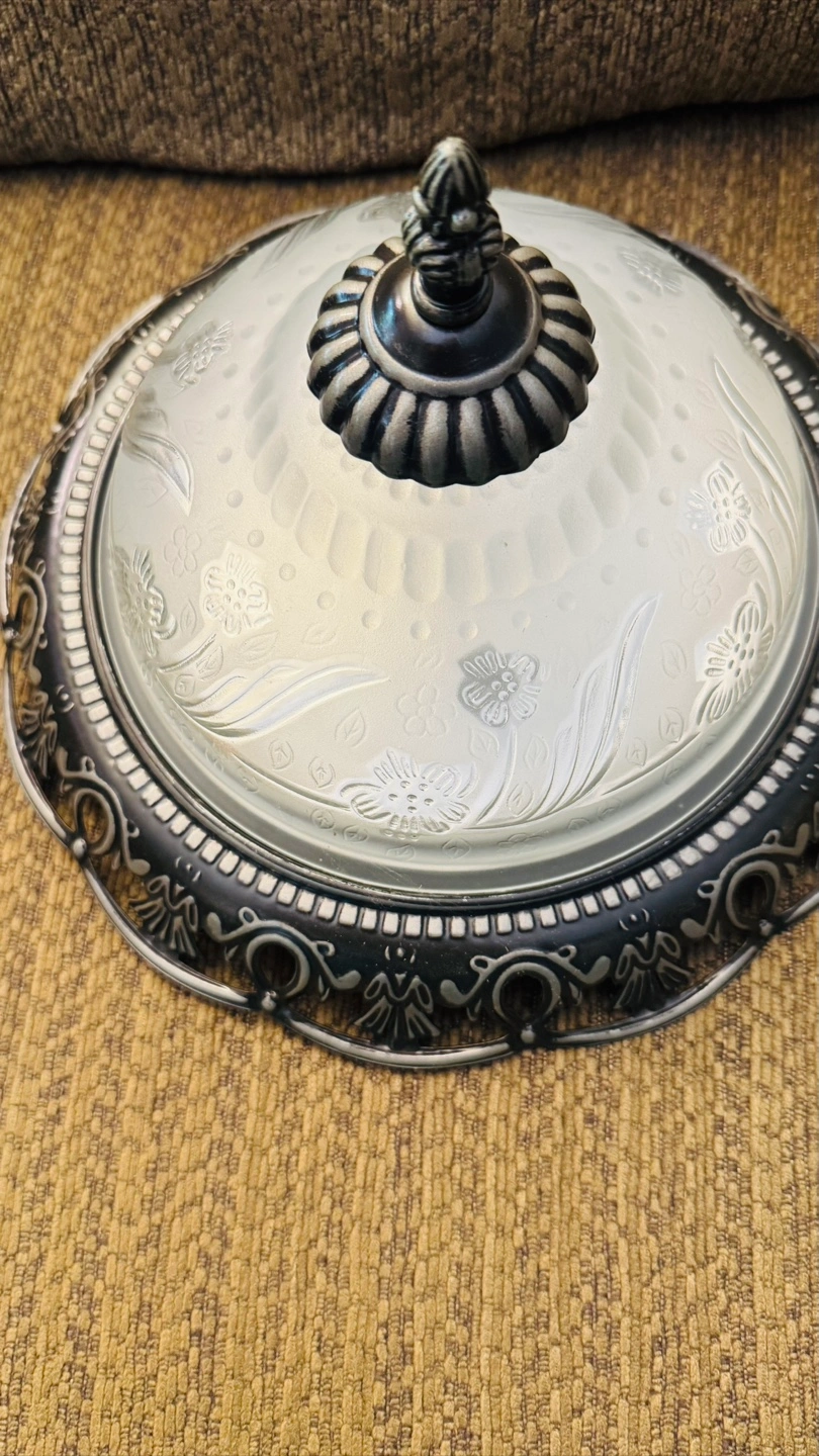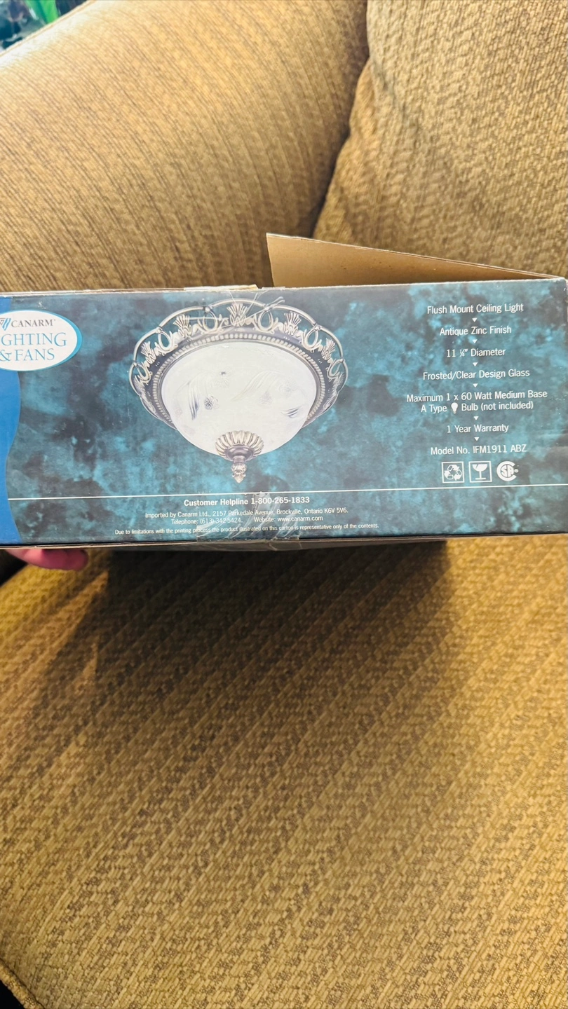 89Selling a CANARM Semi-Plafonnier in antique zinc finish. It's 15" x 15" in size. The glass is described as givree/claire. The box is included. It has a decorative zinc-tone metal frame and a frosted glass shade with floral accents. The fixture is in very good condition Total 5 units Semi-Flush@ 30.00$ each 1 flush mount light @ 15.00$