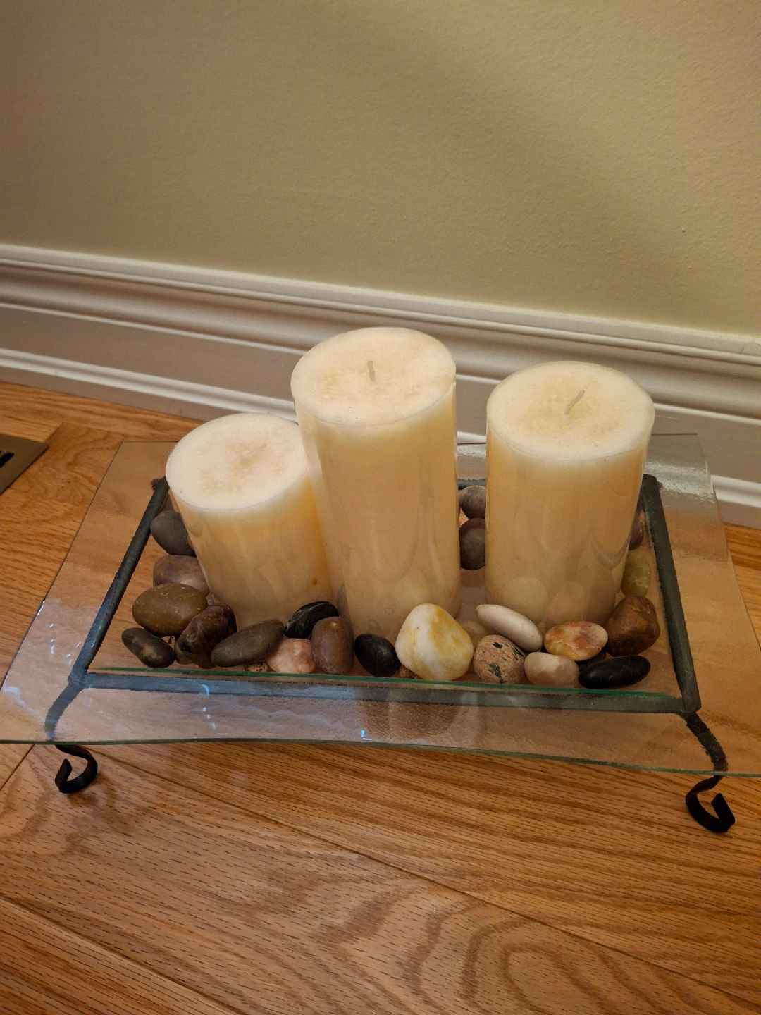 Selling a candle holder with three candles and decorative stones. It's in great shape and would look lovely in any room of your home!
