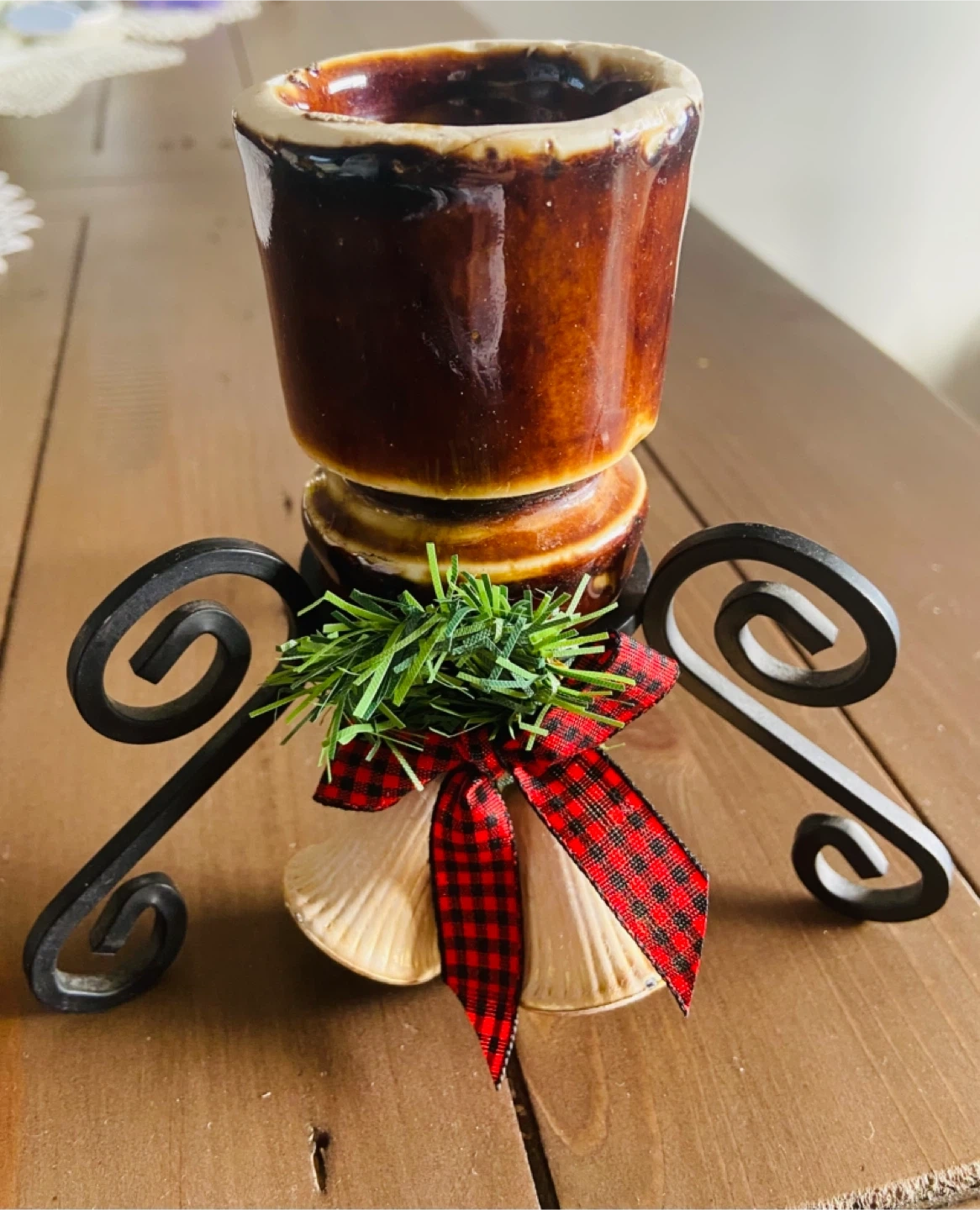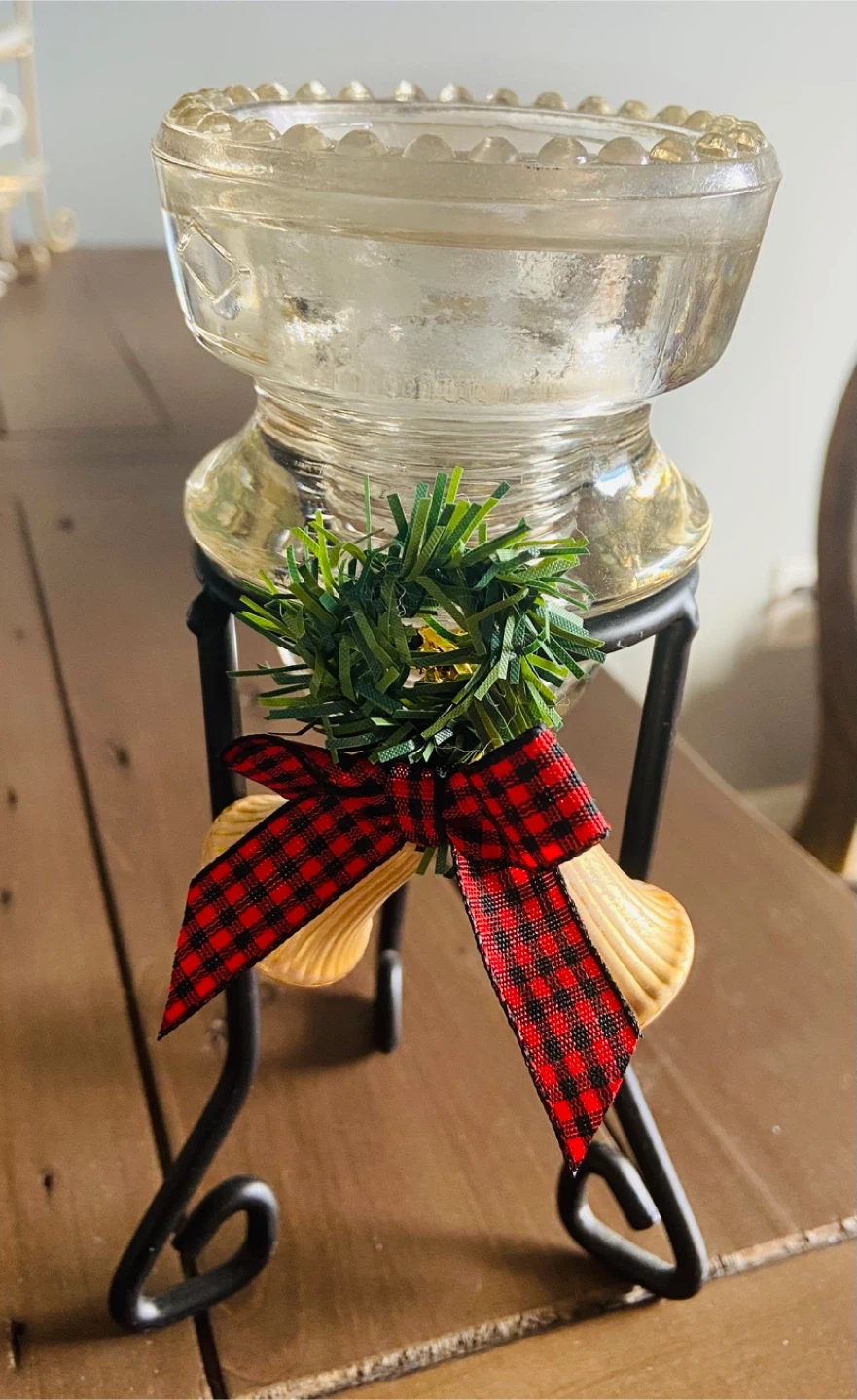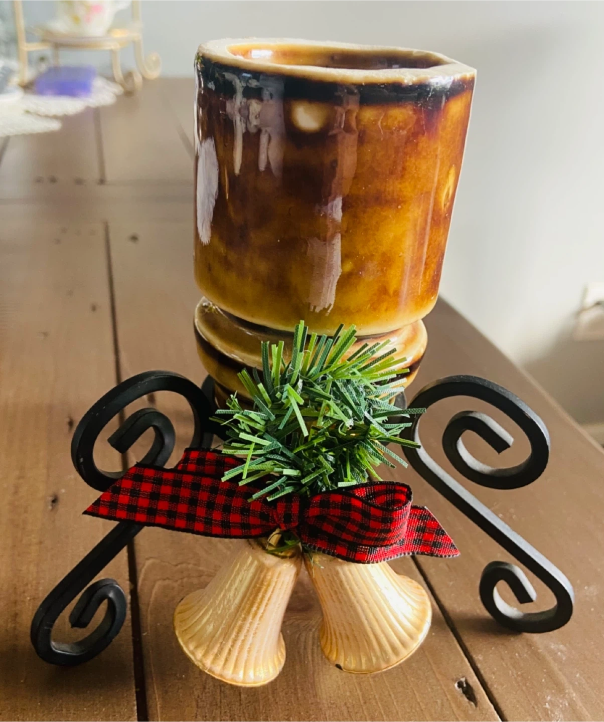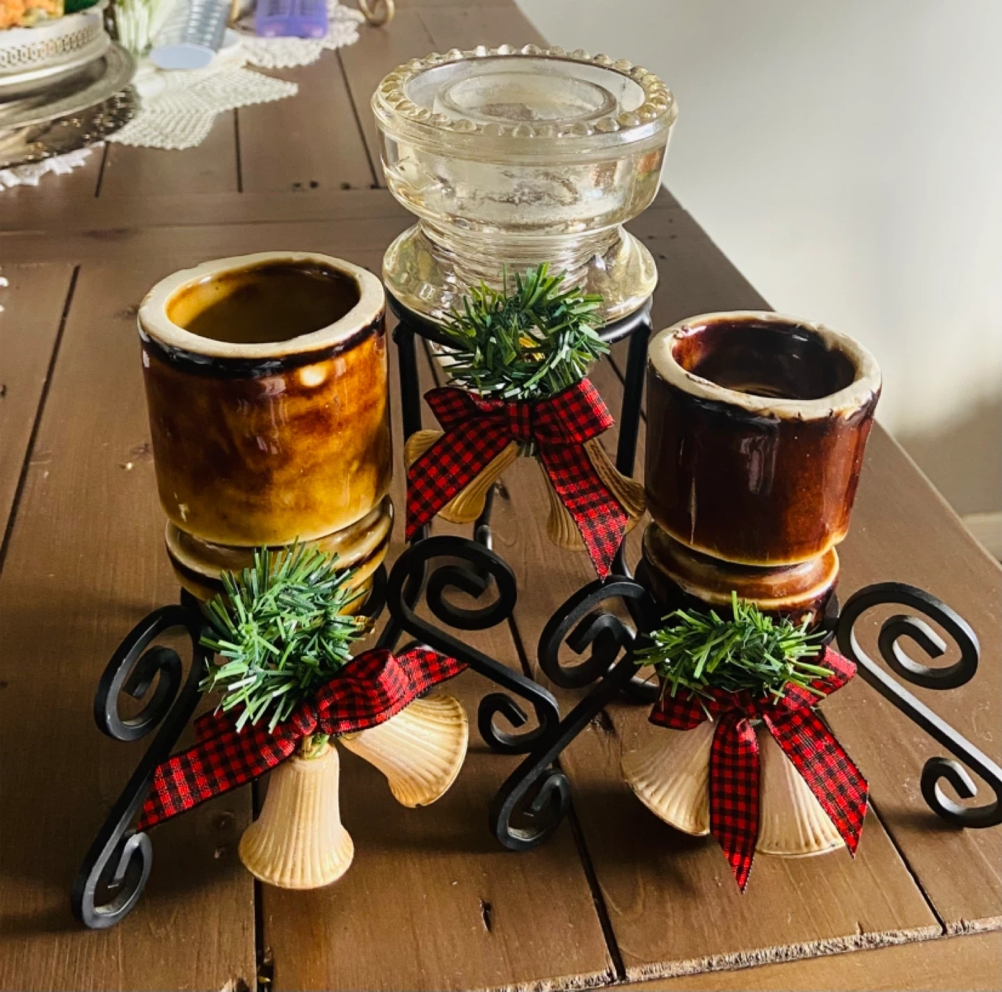 10I'm selling a cute candle holder! It comes with a metal stand, bells, and a red and black checkered bow. Perfect for adding a touch of charm to your home decor The big clear one is $15 Two small brown one are $12 each