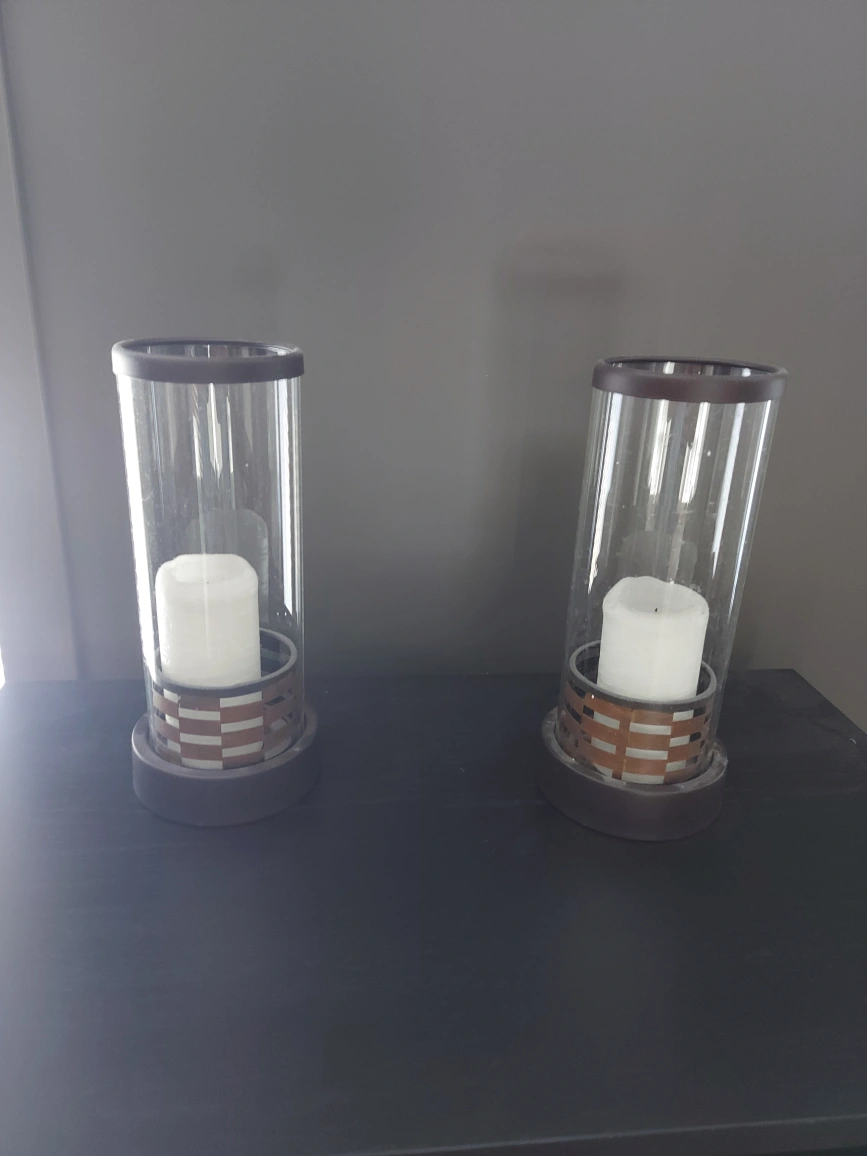 Selling a set of two candle holders. They feature a glass cylinder with a brown trim and a decorative woven base. Perfect for adding a warm glow to any room!