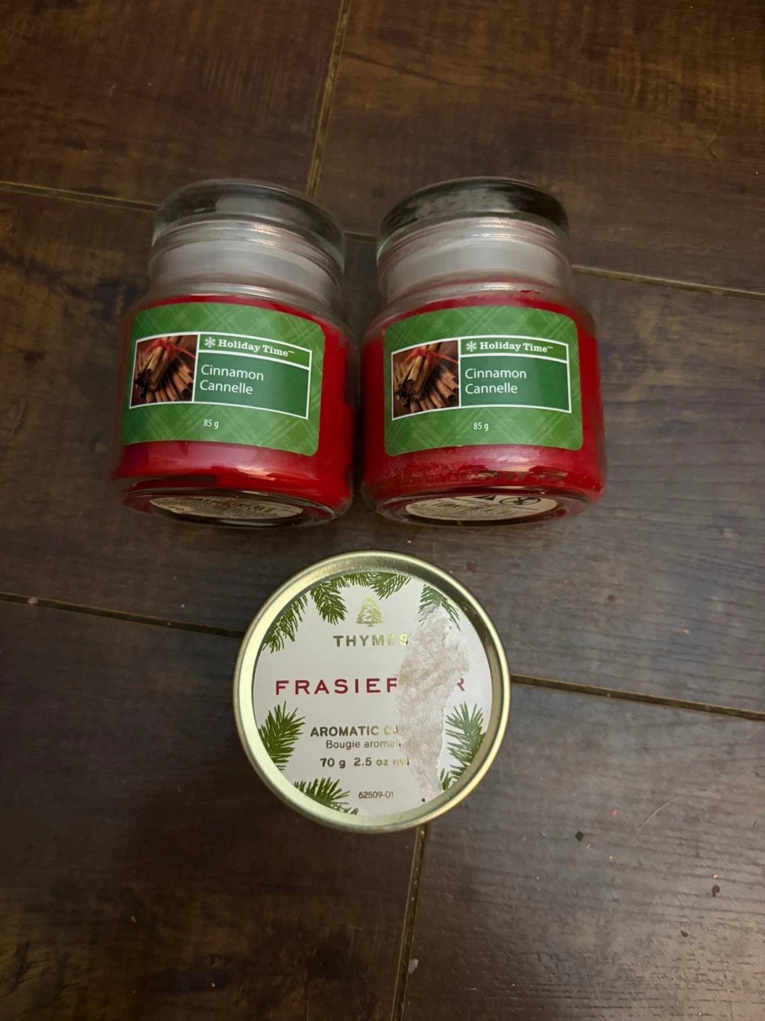 65Selling two Holiday Time Cinnamon Cannelle candles (85g each) and one Thymes Frasier Aromatic candle (70g/2.5 oz)