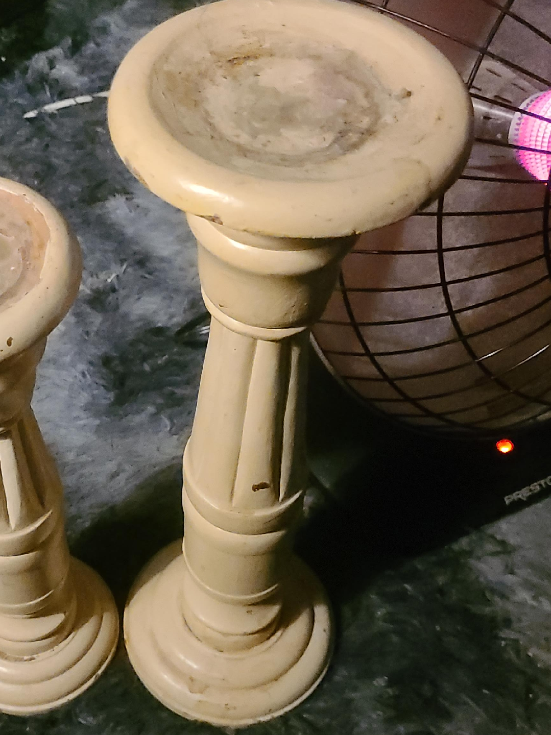 60Selling a pair of candlestick holders. They have a creamy, off-white colour and a classic design. Perfect for adding a touch of elegance to your home decor!