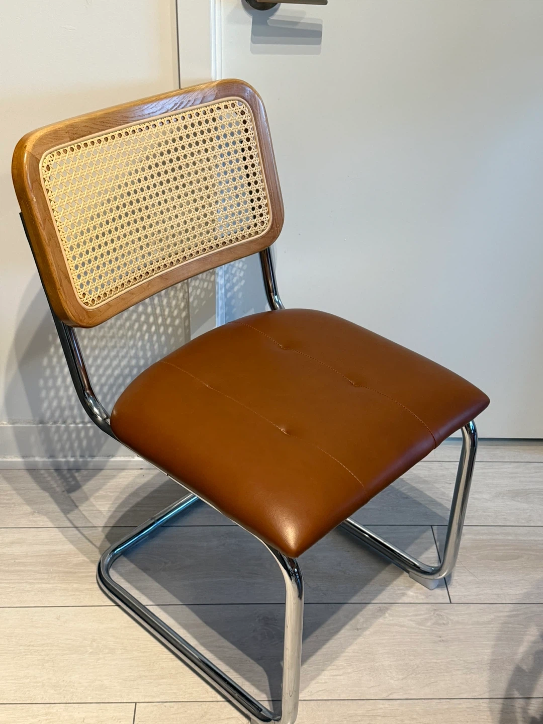 Selling a stylish chair with a cane back and a comfortable brown leather seat. The frame is made of chrome, giving it a modern look. It's in great shape and would be a nice addition to any room!