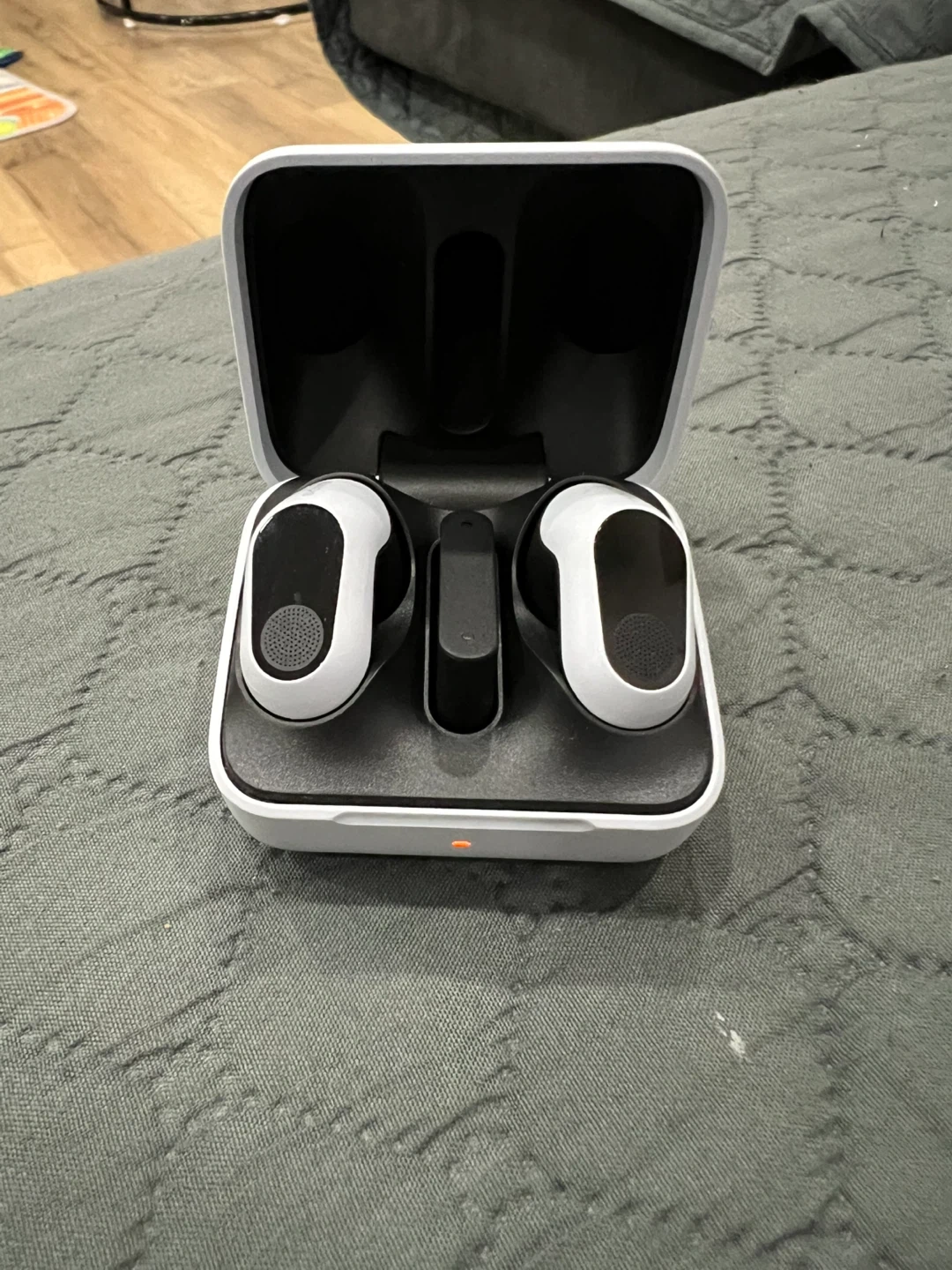 Sony wireless earbuds in a charging case. These earbuds are black and white. They provide a comfortable fit for extended listening sessions.