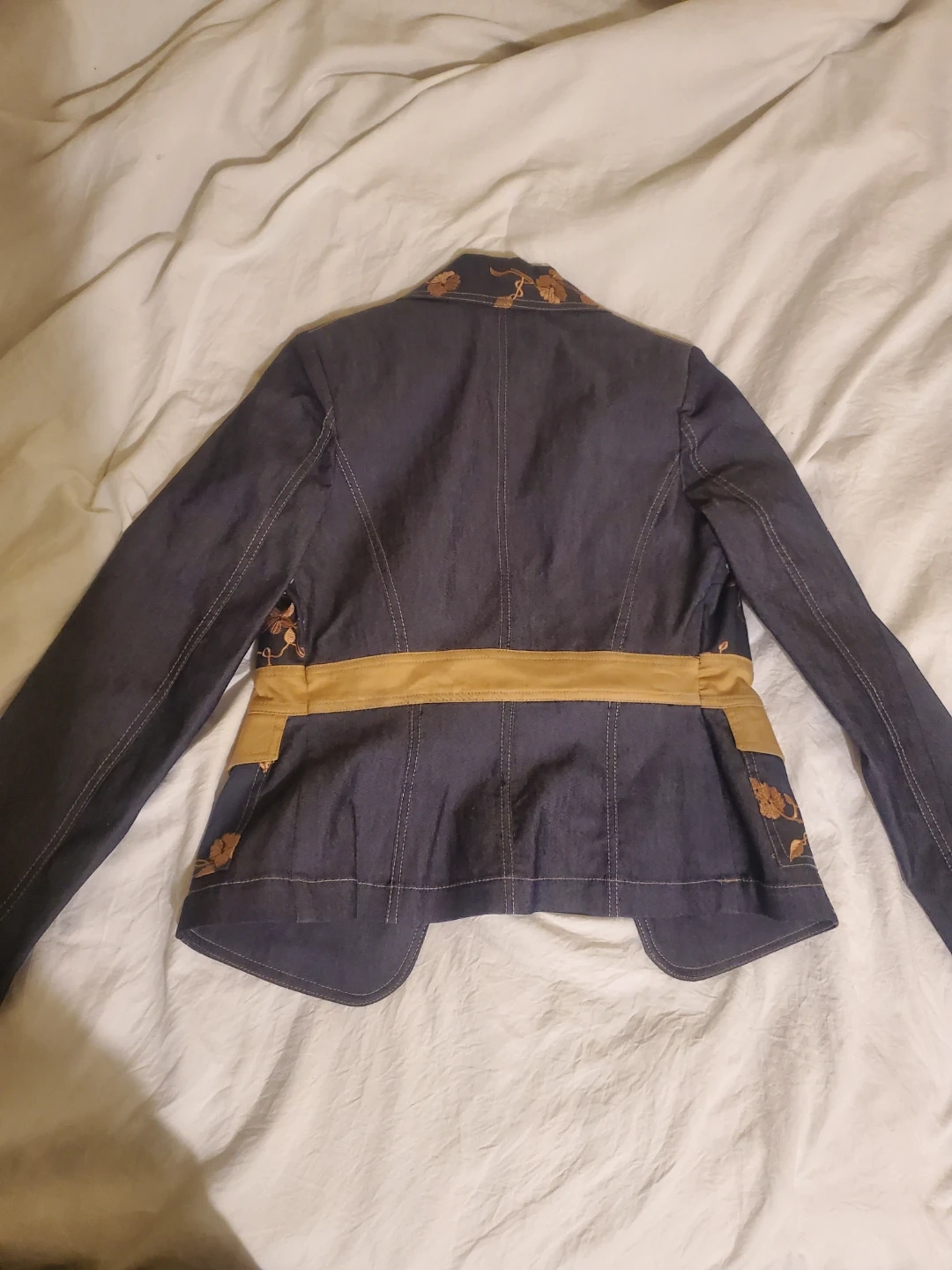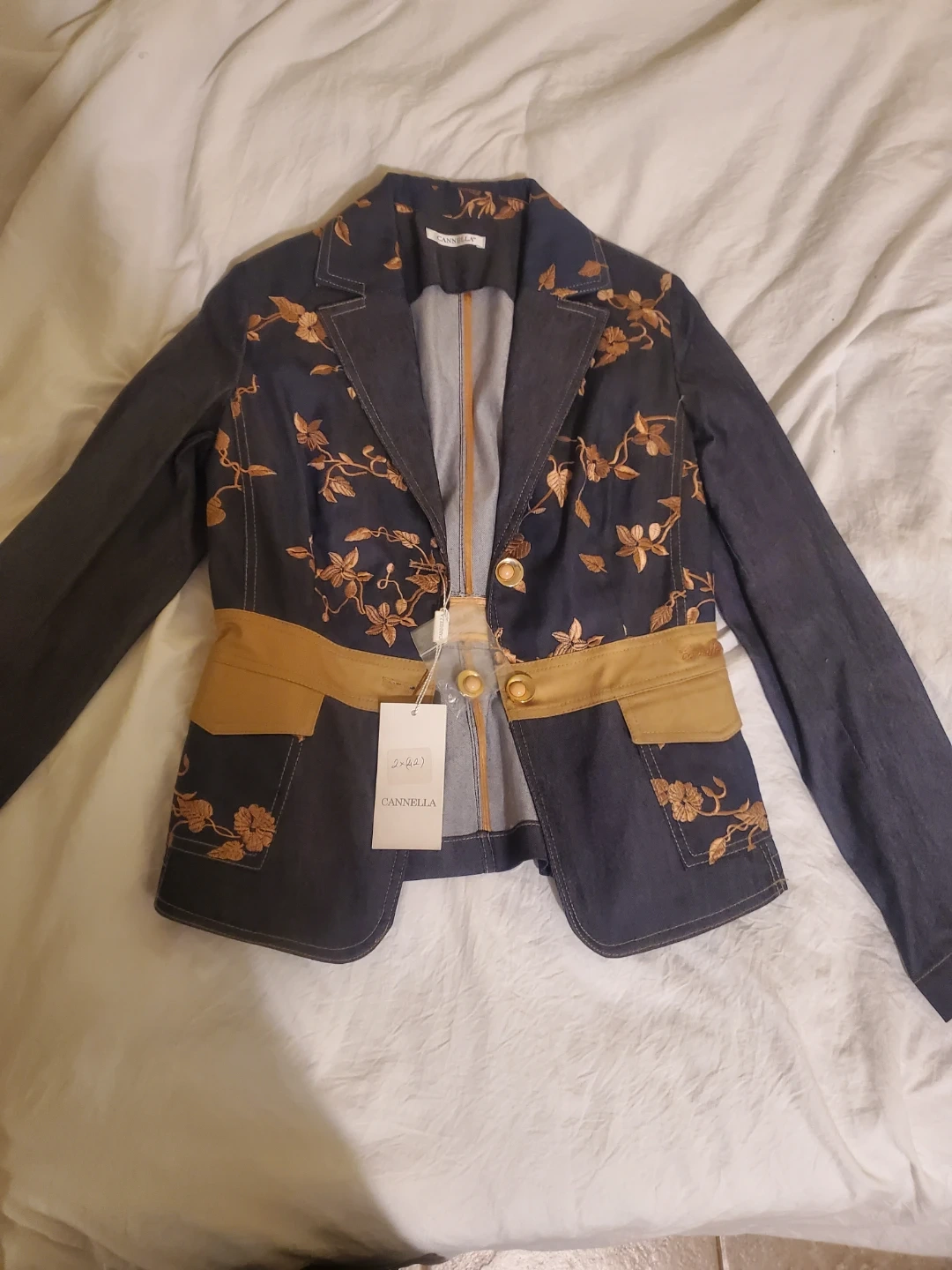 10Here's a stylish Cannella denim jacket with a unique floral design! It's a size 44 and features beautiful embroidery detailing. Perfect for adding a touch of elegance to any outfit!