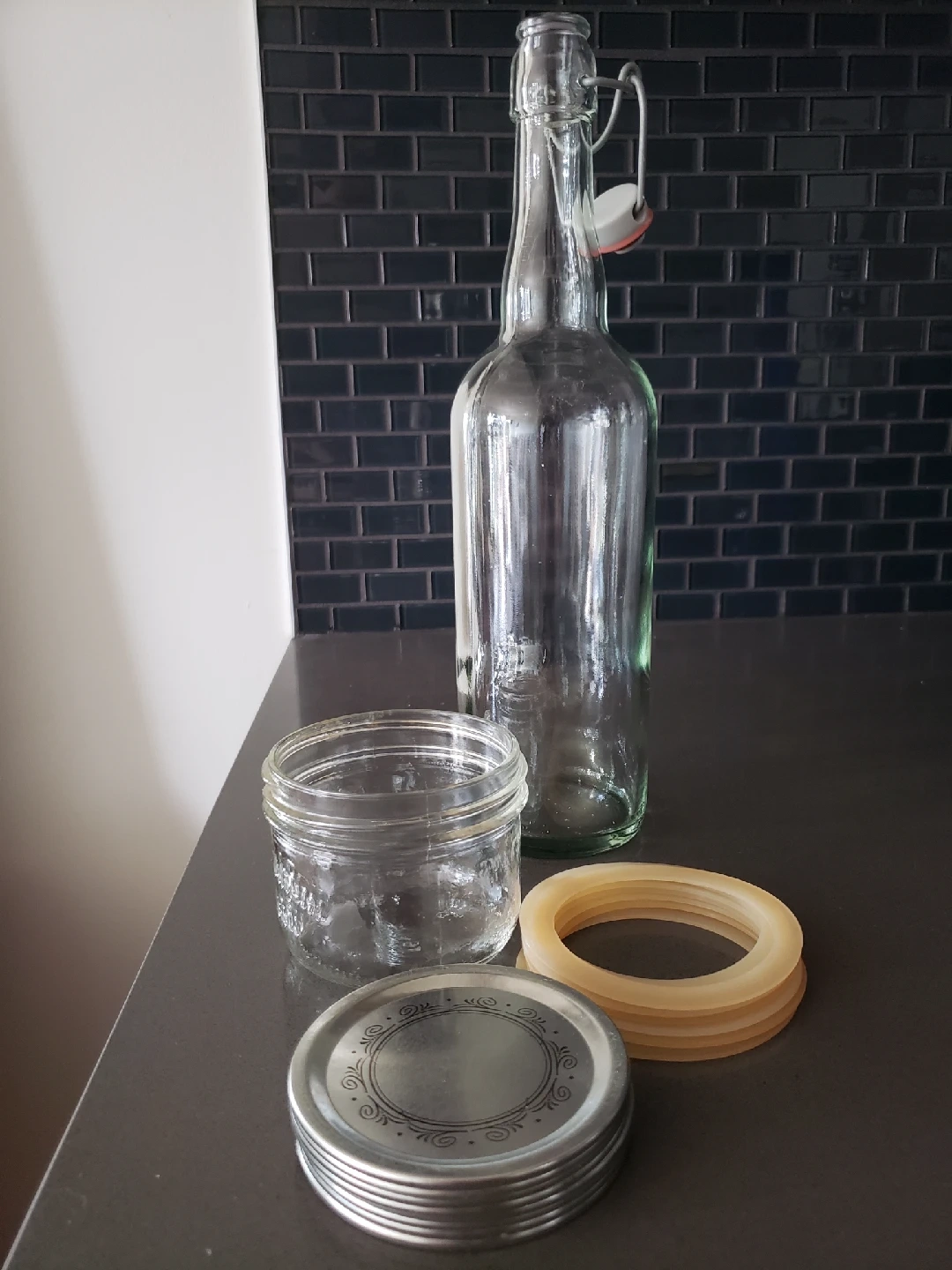 Gifting 8 canning lids and silicone rings plus a clear glass bottle with a swing top, a small glass mason jar. Great for canning or storage!