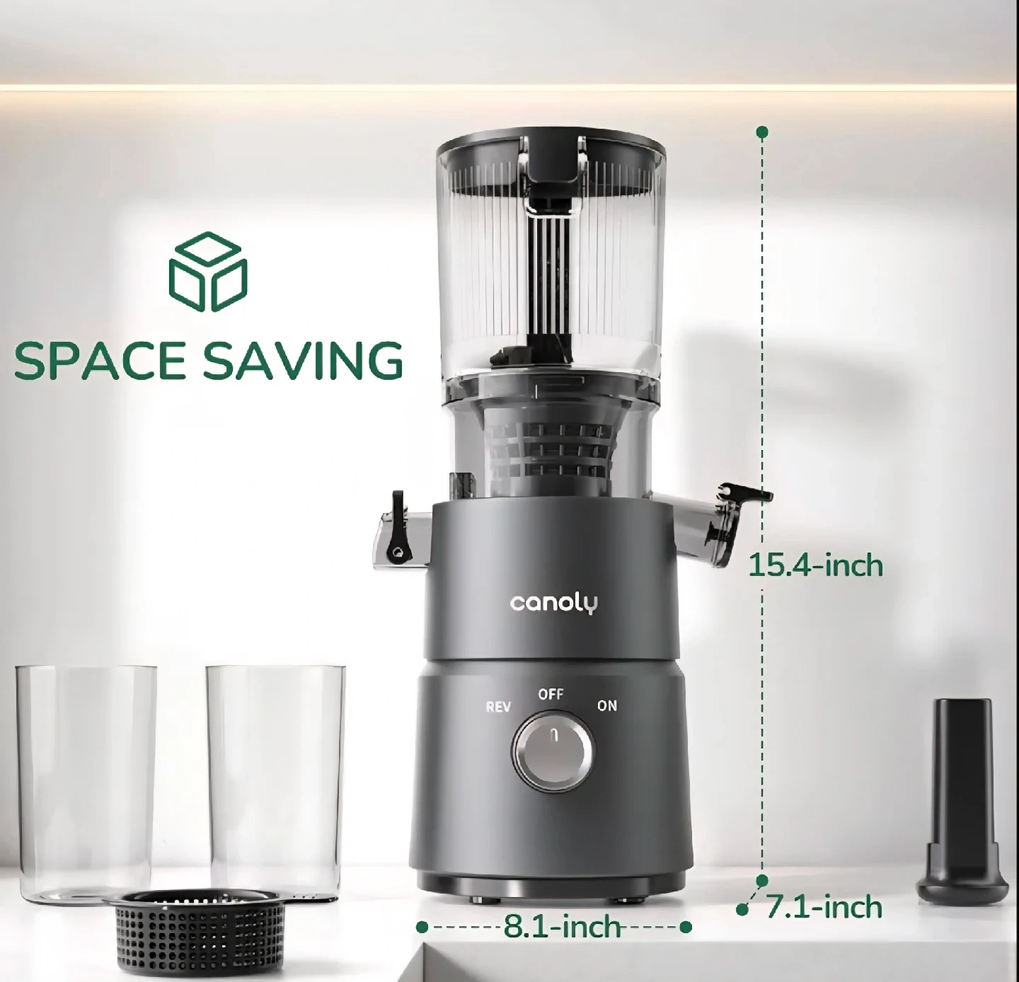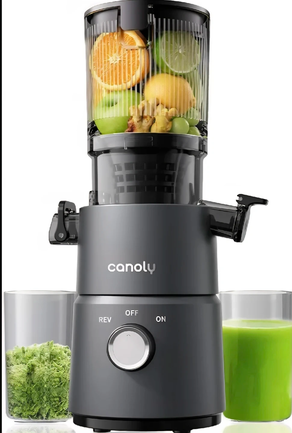 131This is a Canoly juicer, perfect for making fresh and healthy juices at home! Get your daily dose of vitamins with ease! Canoly Cold Press Juicer, 350W Slow Masticating Juicer with 4.5" Wide Feed Chute, Supports Whole Fruits and Vegetables, Reverse Function, Easy to Clean with Brush, Grey -Open Box