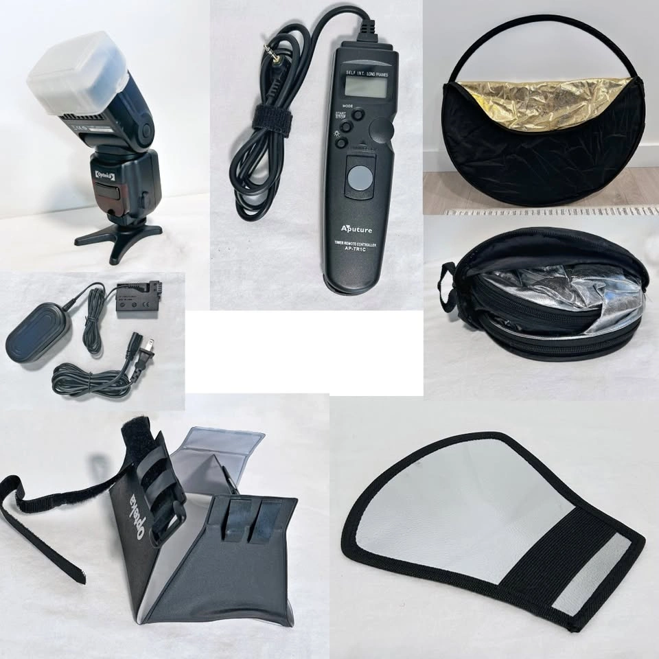 70A complete photography/videography starter kit built around the Canon EOS 550D (Rebel T2i). Jump into photography, filmmaking and studio lighting with two lenses, a dedicated flash, and a wide array of essential accessories. Perfect bundle for a student! The Core Kit: Camera & Lenses: *Canon EOS 550D (Rebel T2i) Body Highly-regarded 18 MP entry-level DSLR capable of Full HD 1080p video. Excellent, well-maintained. Includes battery, AC adapter and body cap. *Canon EF-S 18-55mm Kit Lens Versatile zoom range for everyday shooting and landscapes. Includes lens cap. *YONGNUO YN50mm F1.8 Prime Lens Fast, large-aperture lens excellent for portraits, low-light, and achieving beautiful background blur (bokeh). Includes lens cap *HOYA 58mm UV(O) Filter Essential glass protection for one of your lenses. Pro Accessories & Lighting Gear This extensive collection of accessories makes this kit a true value for creators: Flash & Light Shaping: *Opteka Pro E-TTL Auto-Focus Dedicated Flash: A powerful flash unit for professional results. Includes original case. *Opteka SB-1 Universal Studio Soft Box Flash Diffuser: Softens harsh flash light for more flattering portraits. *Fototech Silver/White TWO SIDED Flash Diffuser Softbox Reflector: Compact, versatile reflector for bounce or fill light. *Ulanzi VIJIM VL120 USB-C LED Video Light: Essential for vlogging, video, and stills, features a built-in 3100mAh rechargeable (USB-C) battery. Dimmable with a wide color temperature range of 3200K to 6500K. Includes 12 color gels for creative lighting effects. Stability & Control: *Amazon Basics 60-Inch Lightweight Tripod with Bag: Provides stable support for sharp photos and smooth video. *Opteka X-GRIP Professional Action Stabilizing Handle: Essential for low-angle shots and steady handheld video. *Aputure AP-TR1C Timer Remote Controller: Advanced remote shutter release for long exposures, time-lapses, and intervalometer functions. Reflector & Storage: *Signstek 5-in-1 22 Inch Collapsible Multi Disc Light Reflector Set: Essential studio accessory for manipulating natural or artificial light (Gold, Silver, White, Black, Translucent). *Canon Professional Camera Bag (Large) *Lowepro Rezo Camera Bag (Smaller, grab-and-go option) Instead of piecing together a kit over time and spending hundreds on individual accessories, you get a fully functional, versatile system in one listing. From capturing stunning shallow depth-of-field portraits with the 50mm prime to setting up professionally lit video interviews with the included LED light and flash modifiers, this kit has you covered. Start shooting immediately with professional-grade gear!