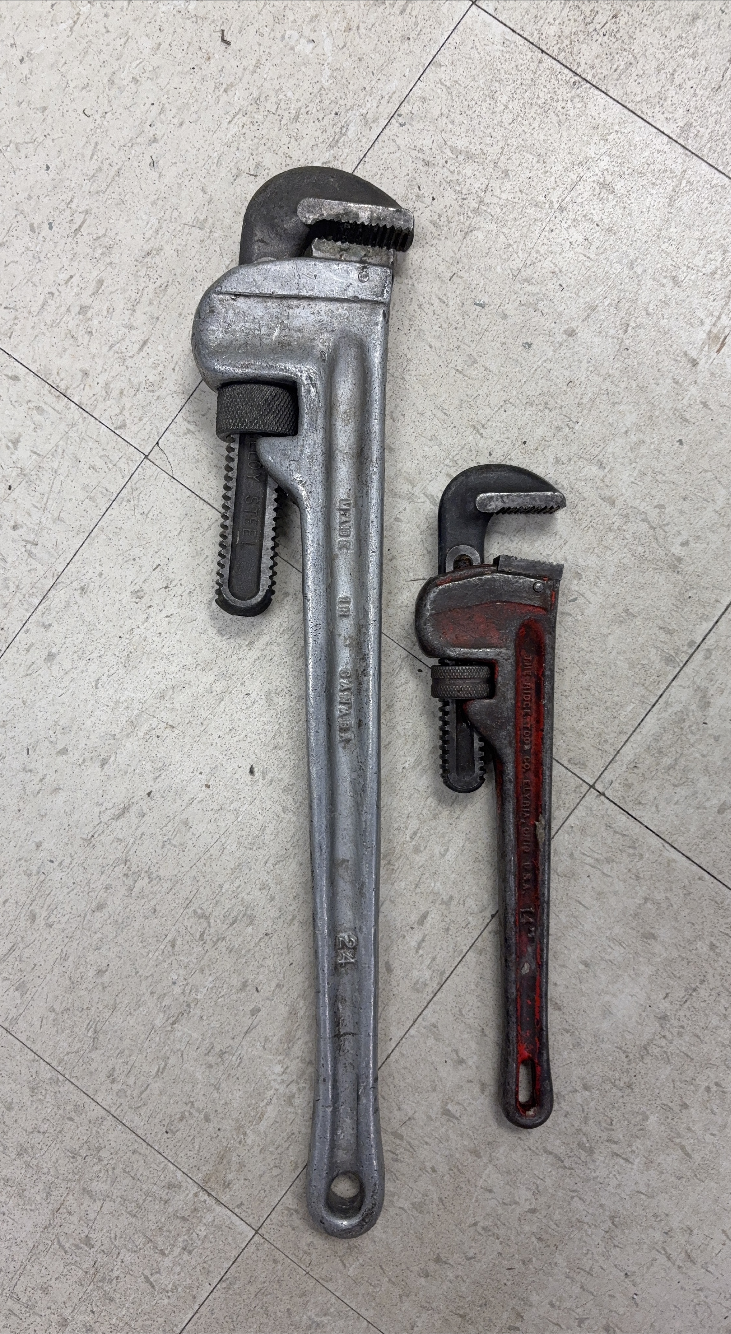 Selling a Cantaga 24-inch pipe wrench alongside a Ridge Tool (Ridgid) 14-inch pipe wrench. Both are showing signs of use but are still ready for work!