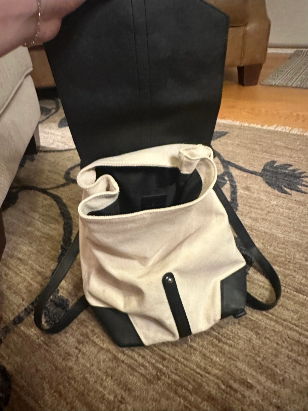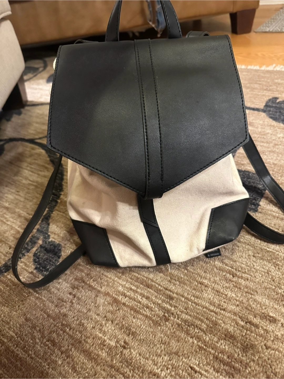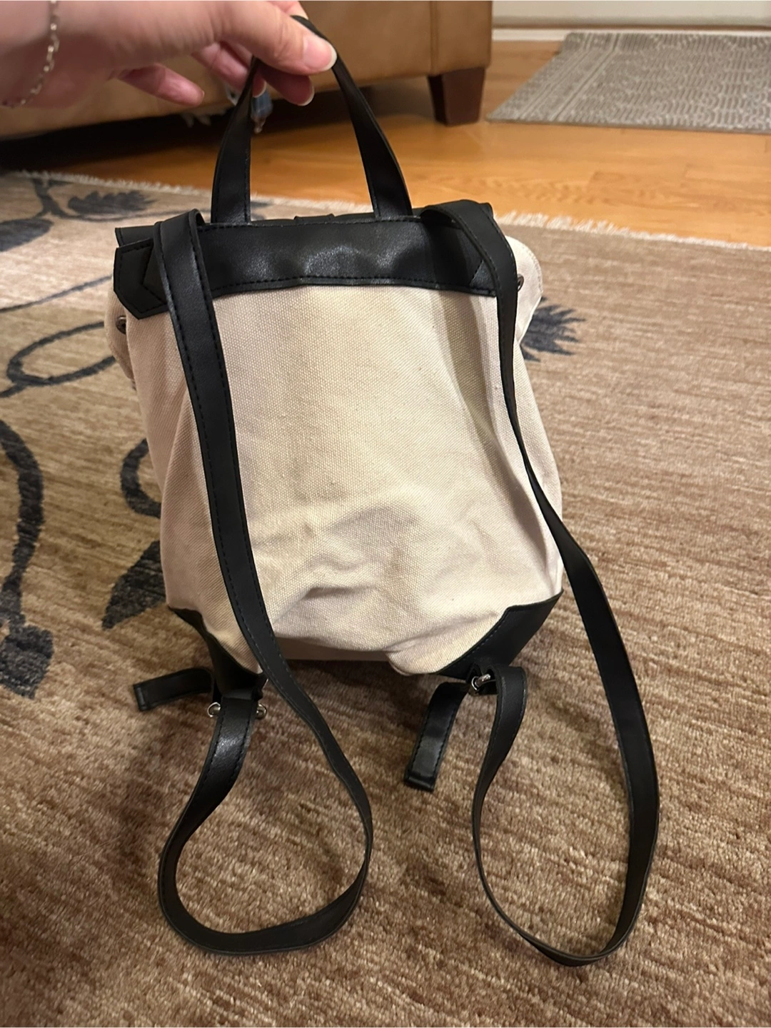 20Selling a cute little backpack! It features a canvas body with faux leather accents in black. It's perfect for carrying your essentials around town. The interior is lined with black fabric and has a few pockets for organization