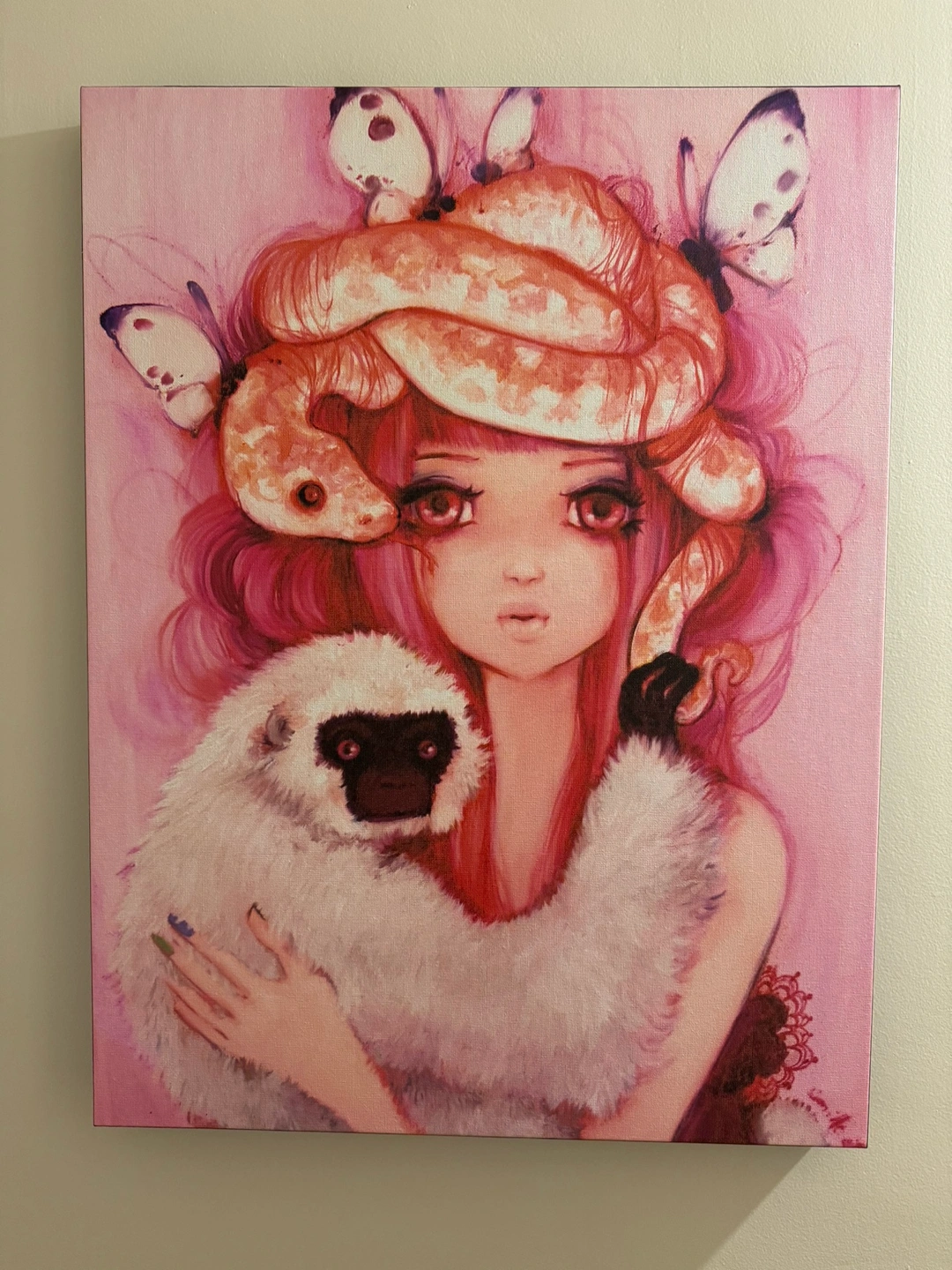 A stretched canvas painting depicting a young girl with butterflies, a snake, and a monkey. High quality canvass print by artist Camilla d’Errico