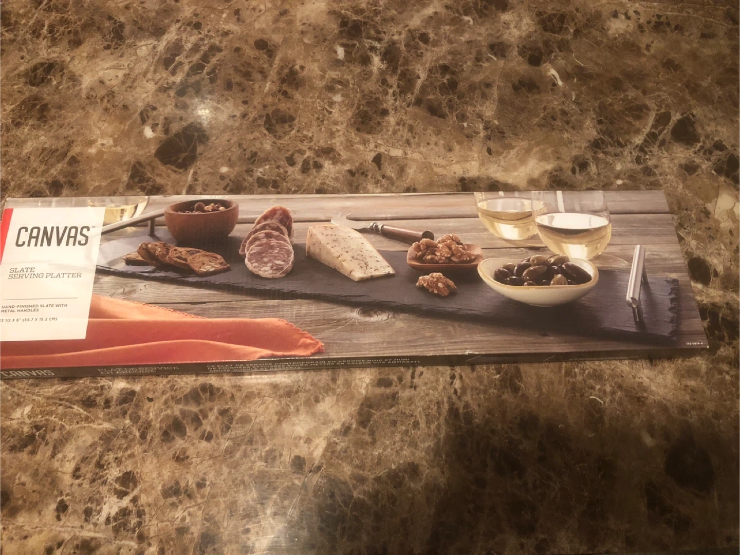 Selling a Canvas Slate Serving Platter! This hand-finished slate platter adds a touch of elegance to any gathering. Perfect for serving cheeses, appetizers, or desserts. Comes in the original box!
